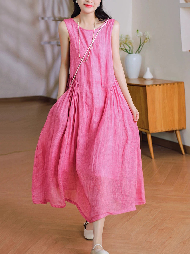 Women Autumn Vintage Pure Color O-Neck Ramie Cotton Dress