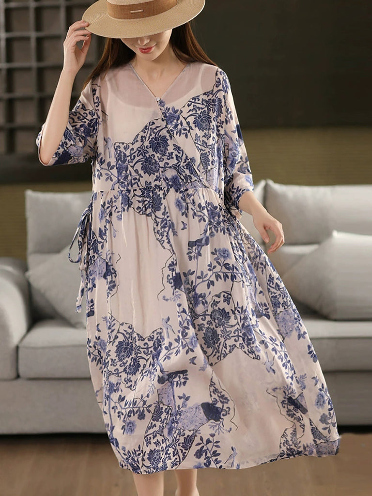 Women Autumn Retro Flower Spliced V-Neck Ramie Dress
