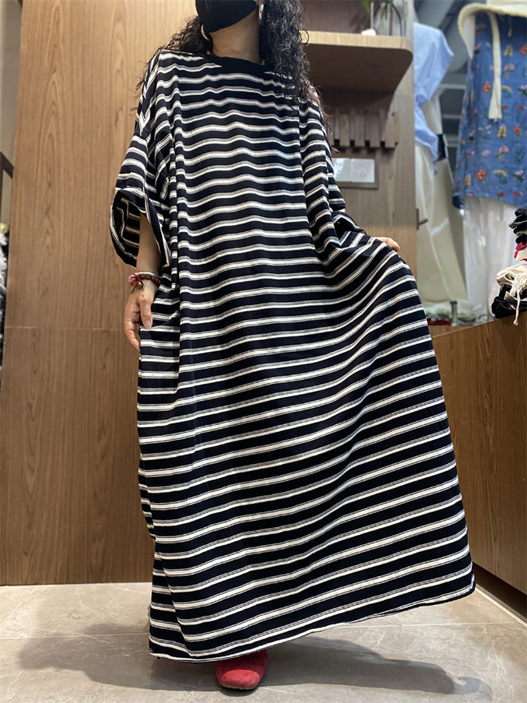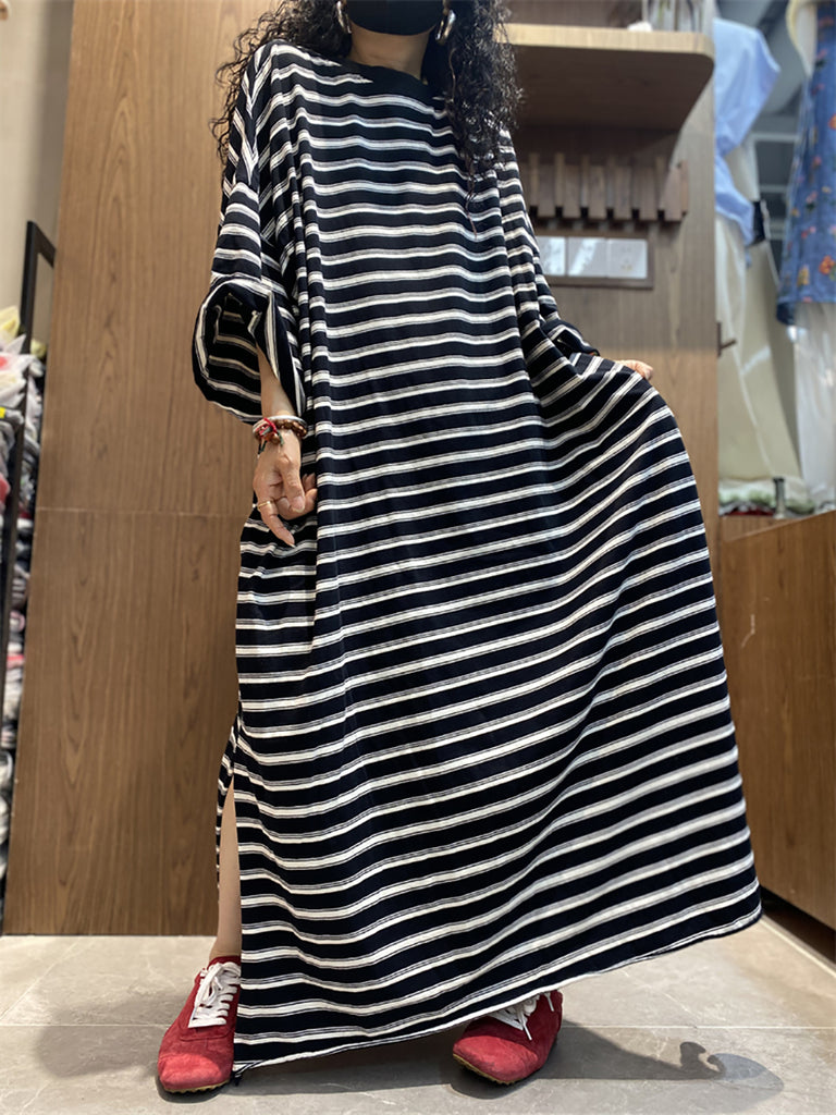 Women Autumn Colorblock O-Neck 100%Cotton Maxi Dress