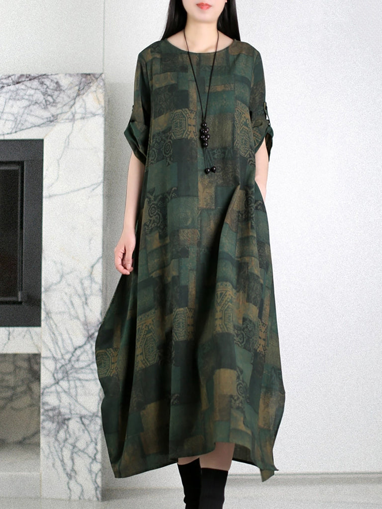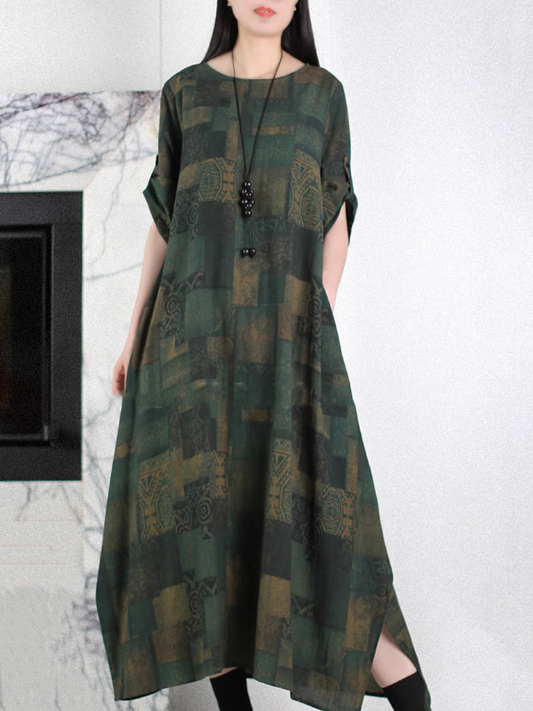 Women Autumn Retro Patchwork O-Neck Cotton Dress