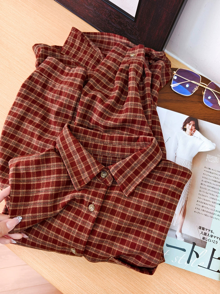 Women Autumn Vintage Plaid Turn-down Collar Shirt