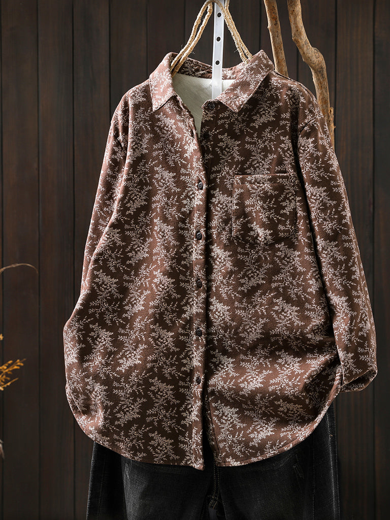 Women Winter Artsy Floral Fleece-lined 100%Cotton Shirt