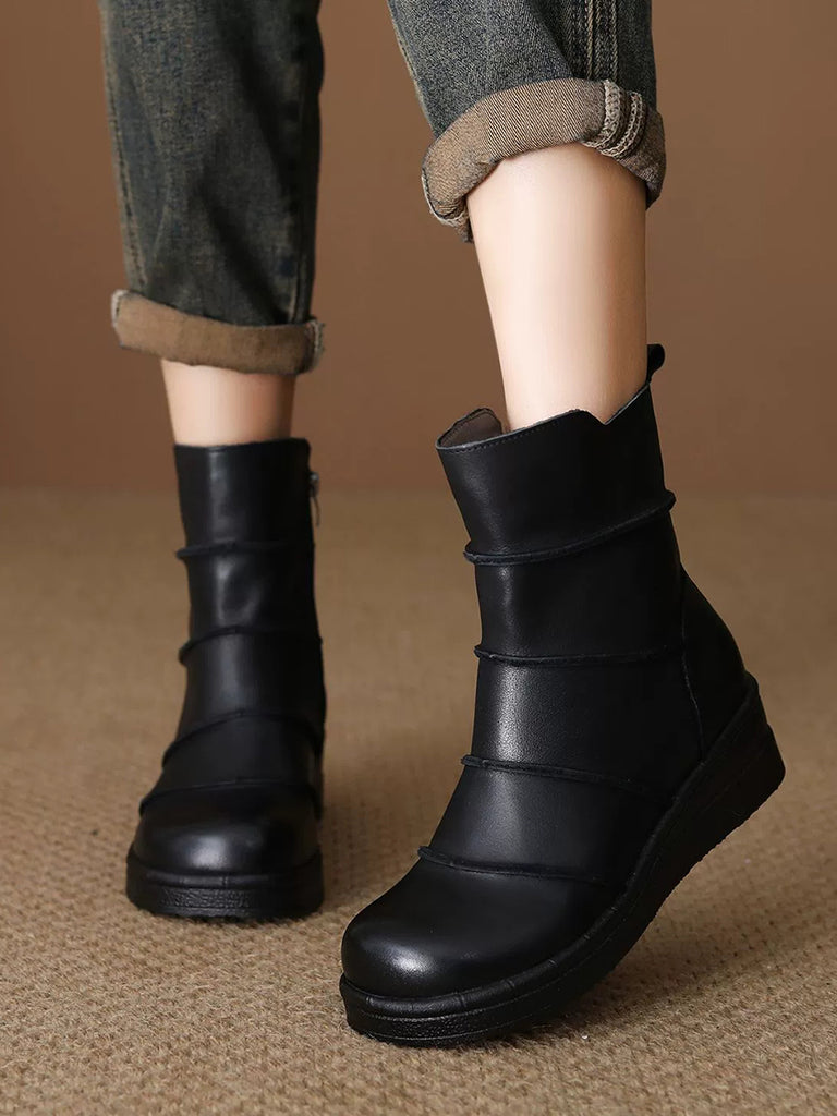 Women Vintage Pure Color Leather Fleece-lined Boots