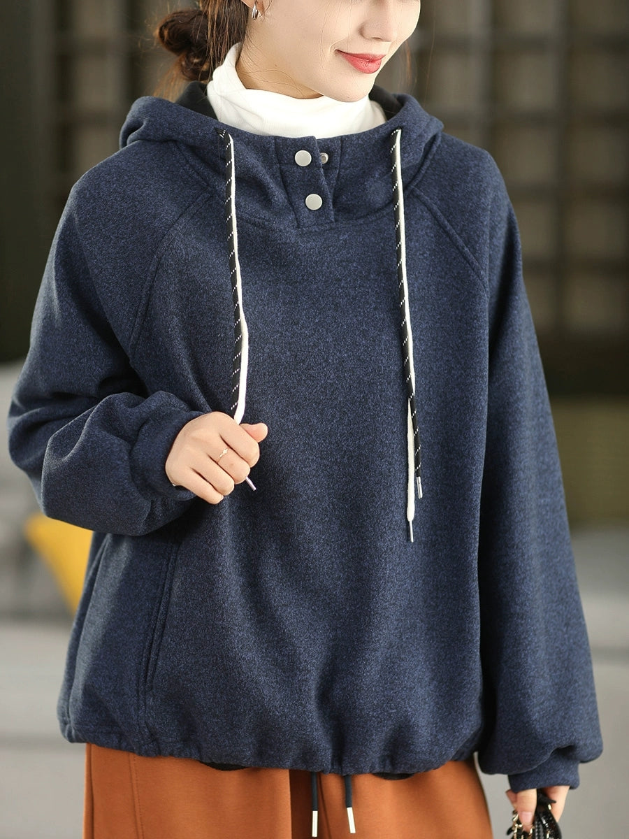 Stay warm and comfortable through cooler months with this versatile hooded blouse. Featuring a classic solid color design and cozy fleece lining, it delivers practical warmth without compromising style. The raglan sleeves provide an easy, relaxed fit perfect for layering or wearing solo, while the full-length coverage keeps you protected from the elements. An ideal transitional piece for autumn and winter wardrobes that balances casual elegance with functional comfort.