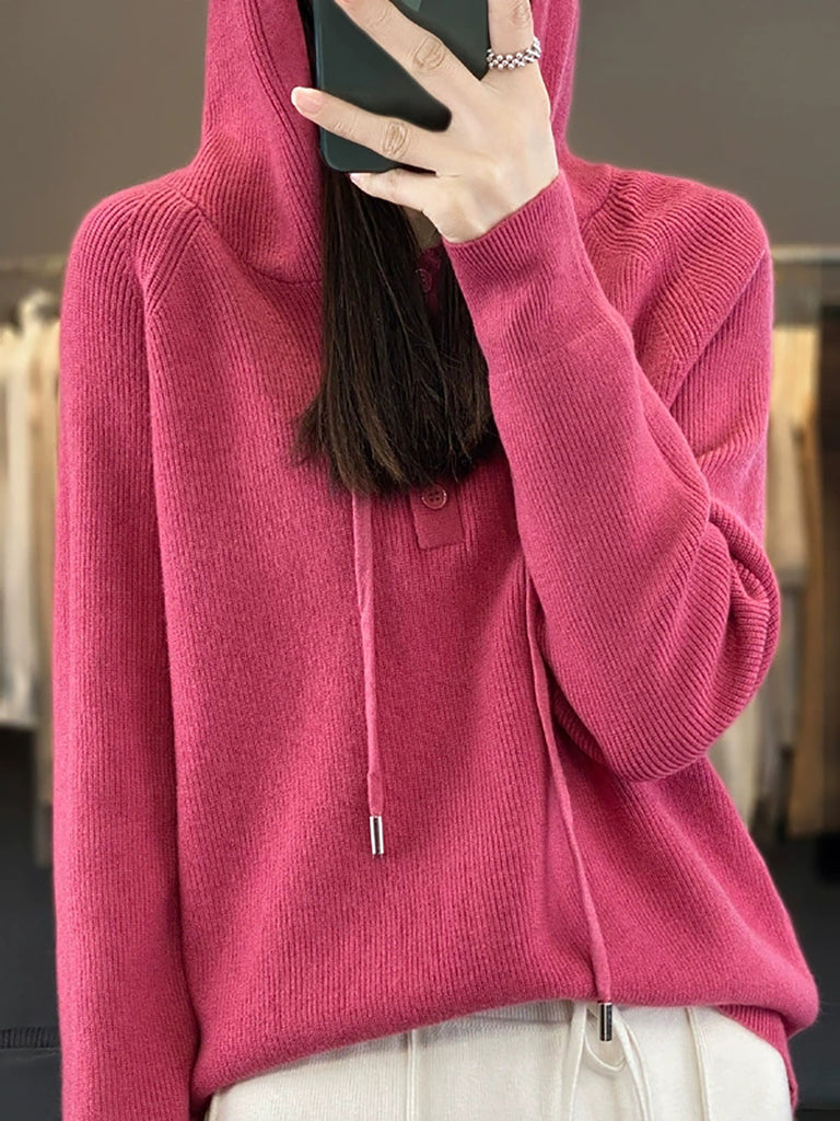 Women Autumn Casual Pure Color Knitted Hooded Sweater