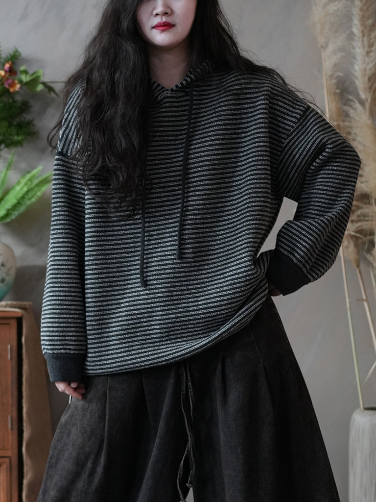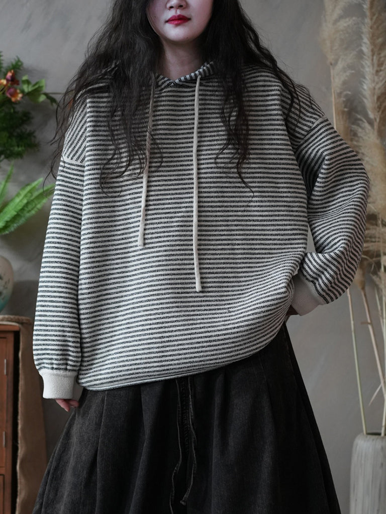 Women Winter Stripe Spliced Turtleneck Fleece-lined Blouse