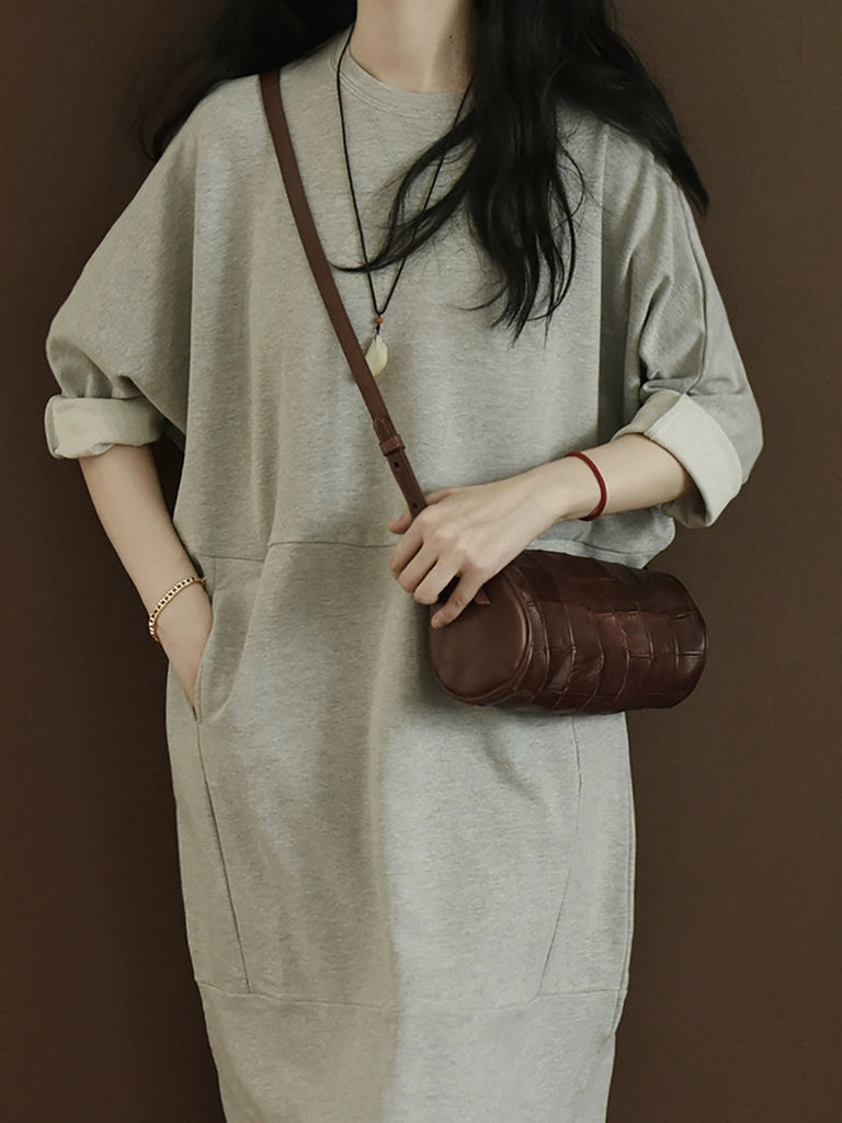 Plus Size Women Autumn Casual Pure Color O-Neck Cotton Dress
