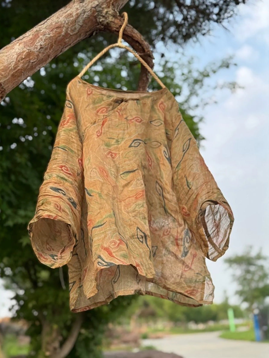 Women Summer Ethnic Flower Ramie O-Neck Shirt