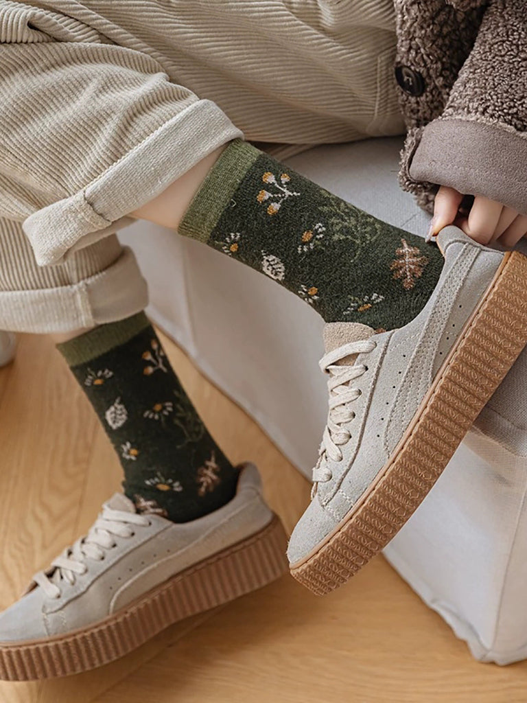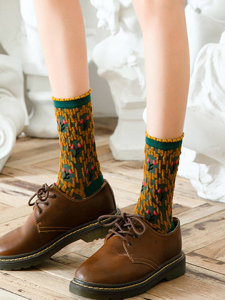 5 Pairs Women Spring Vintage Plant Jacquard Socks