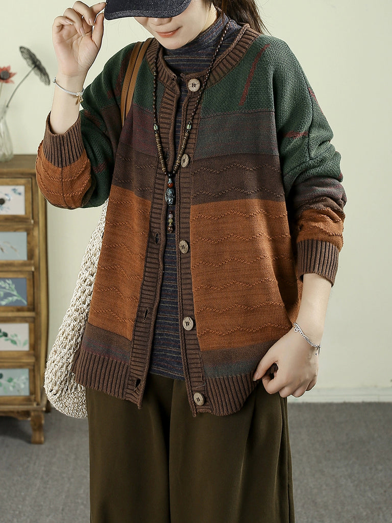Women Autumn Vintage Colorblock O-Neck Knitted Sweater