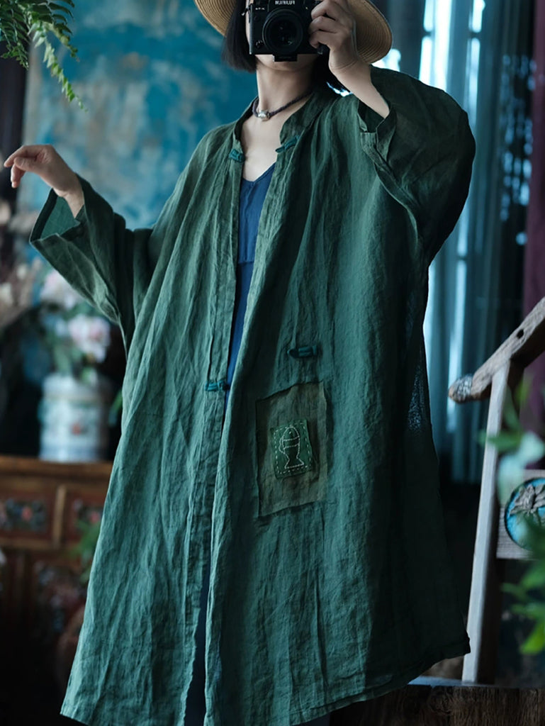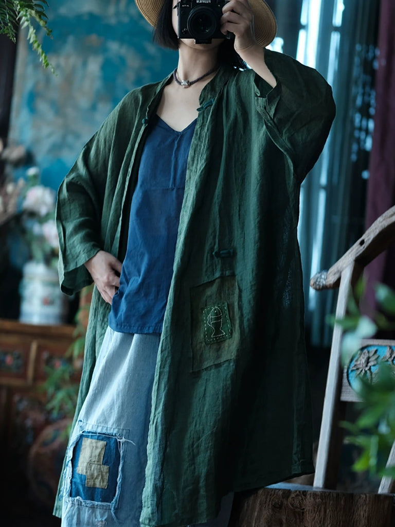 Women Summer Vintage Flower V-Neck Ramie Shirt Coat
