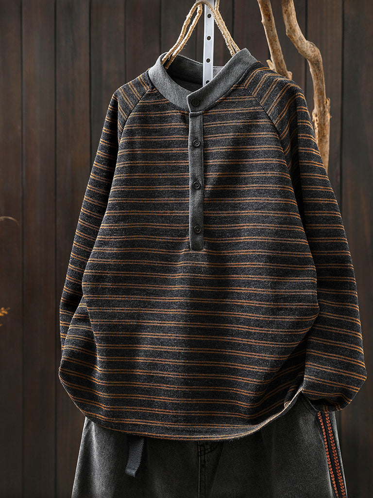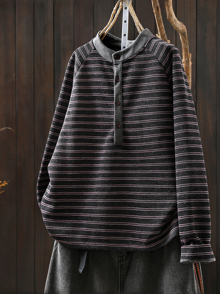 Women Autumn Retro Stripe O-Neck Loose Shirt