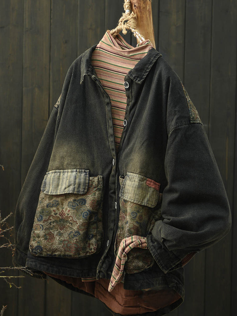 Women Retro Autumn Patchwork Denim Shirt Coat