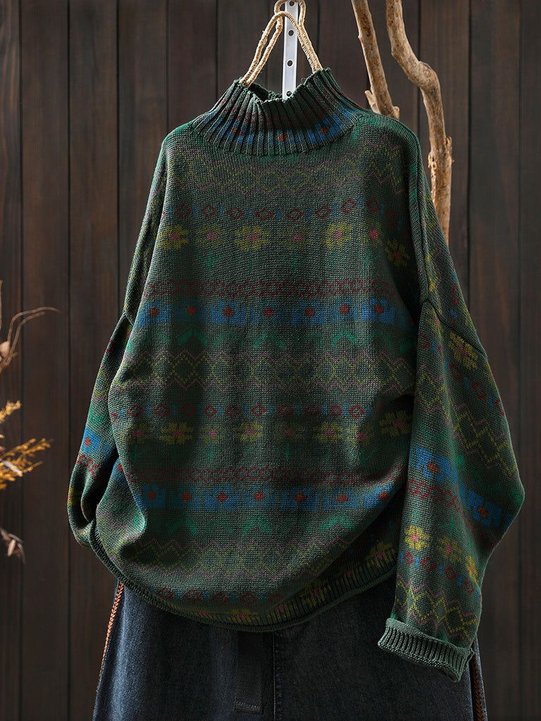 Women Autumn Artsy Flower Half-Turtleneck Sweater