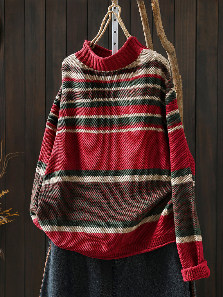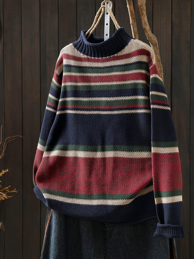 Women Autumn Artsy Stripe Half-Turtleneck Sweater