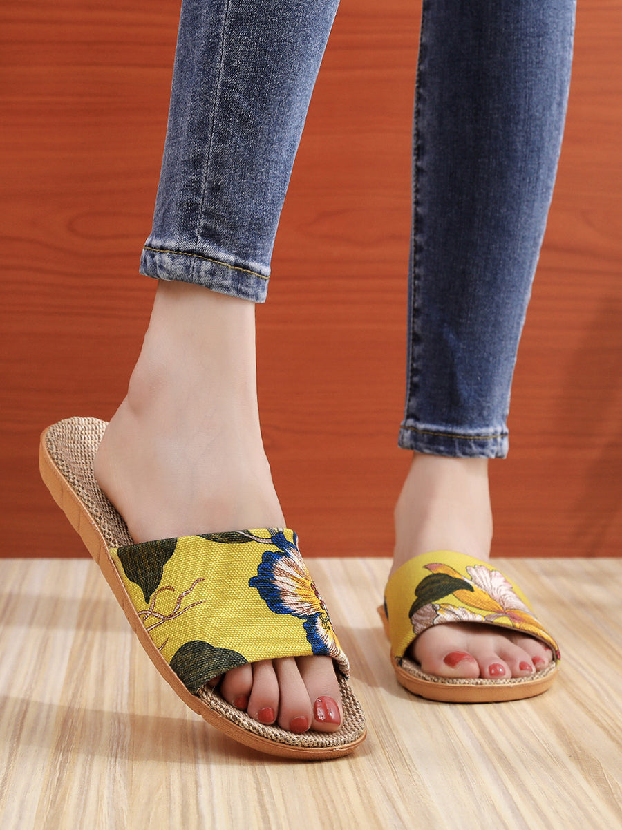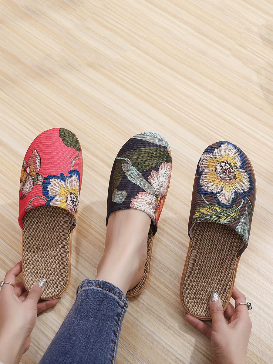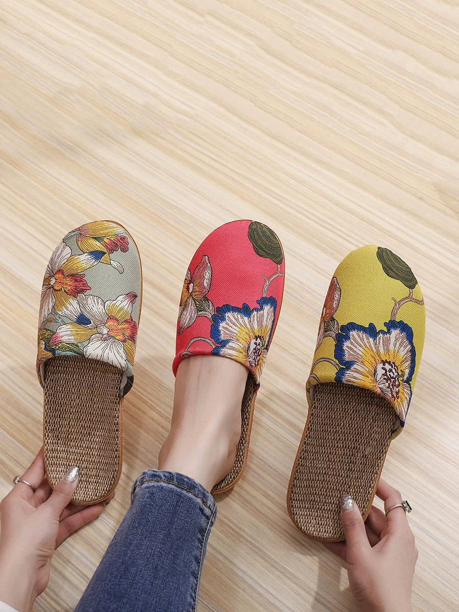 Vintage Flower Linen Indoors Flat Slippers