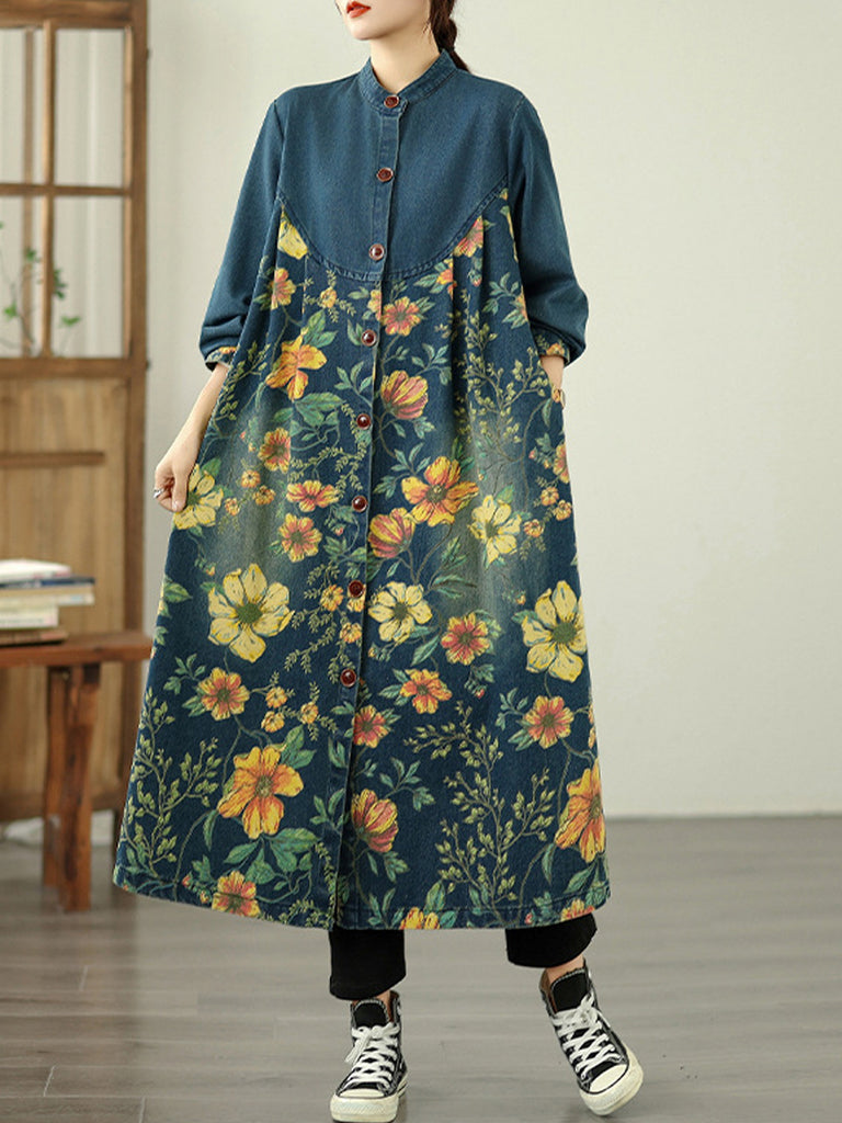 Women Autumn Denim Flower Stand Collar Coat