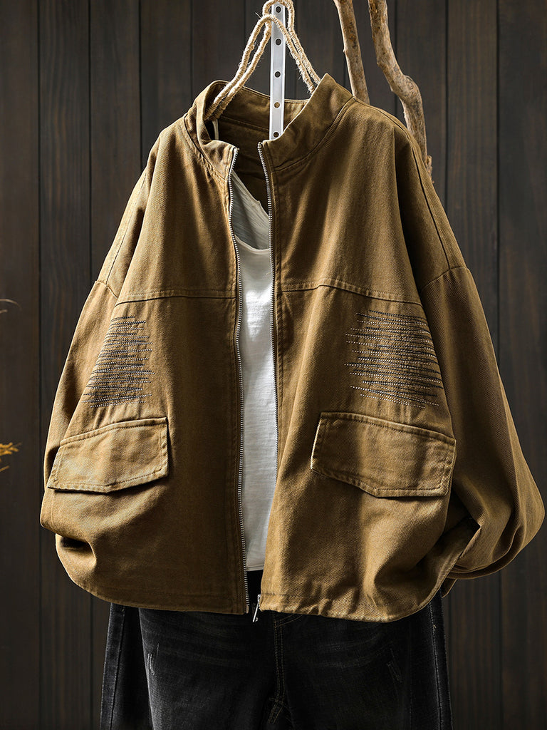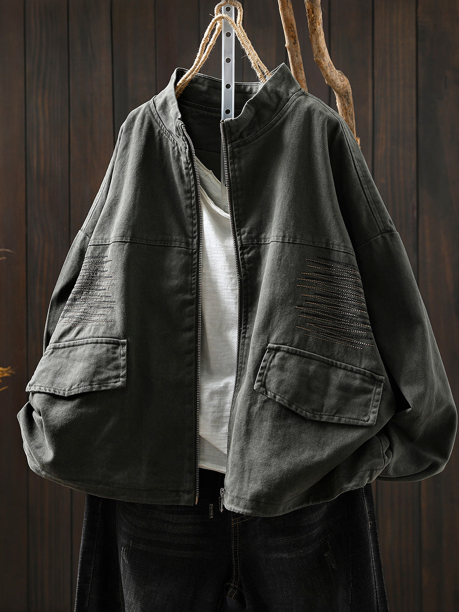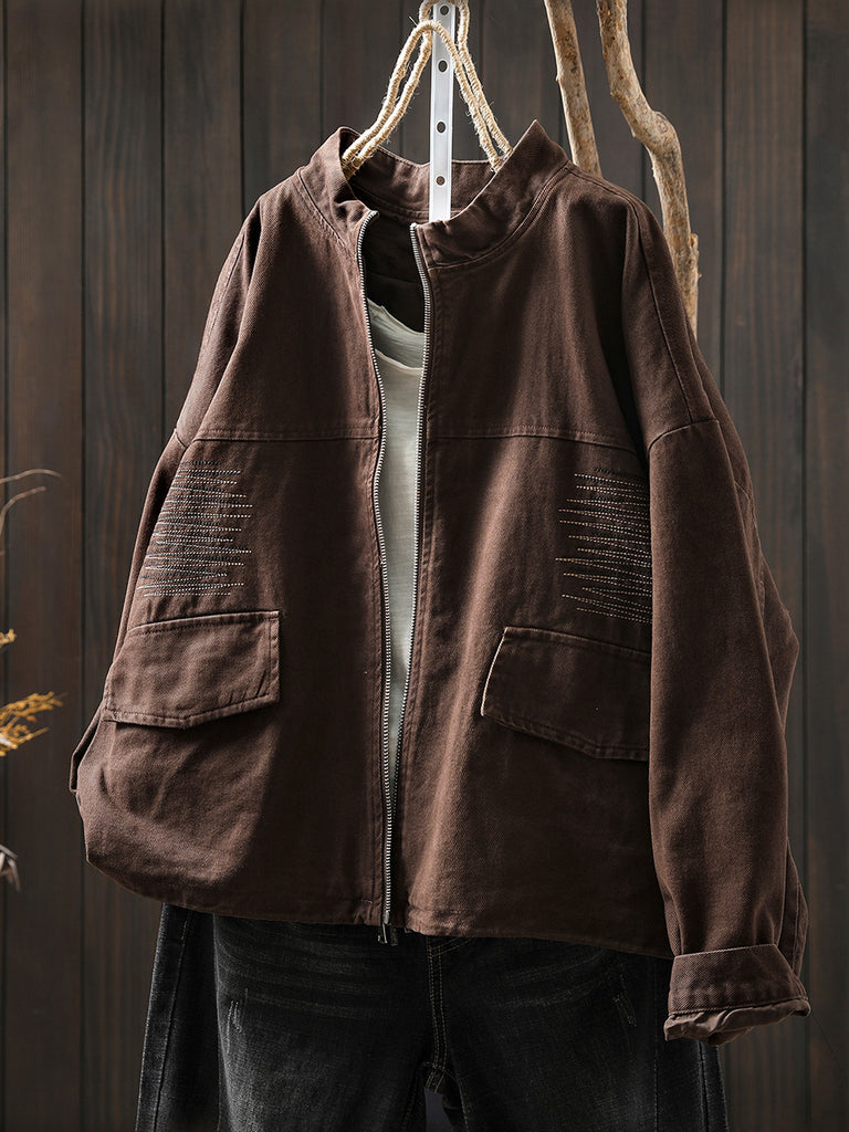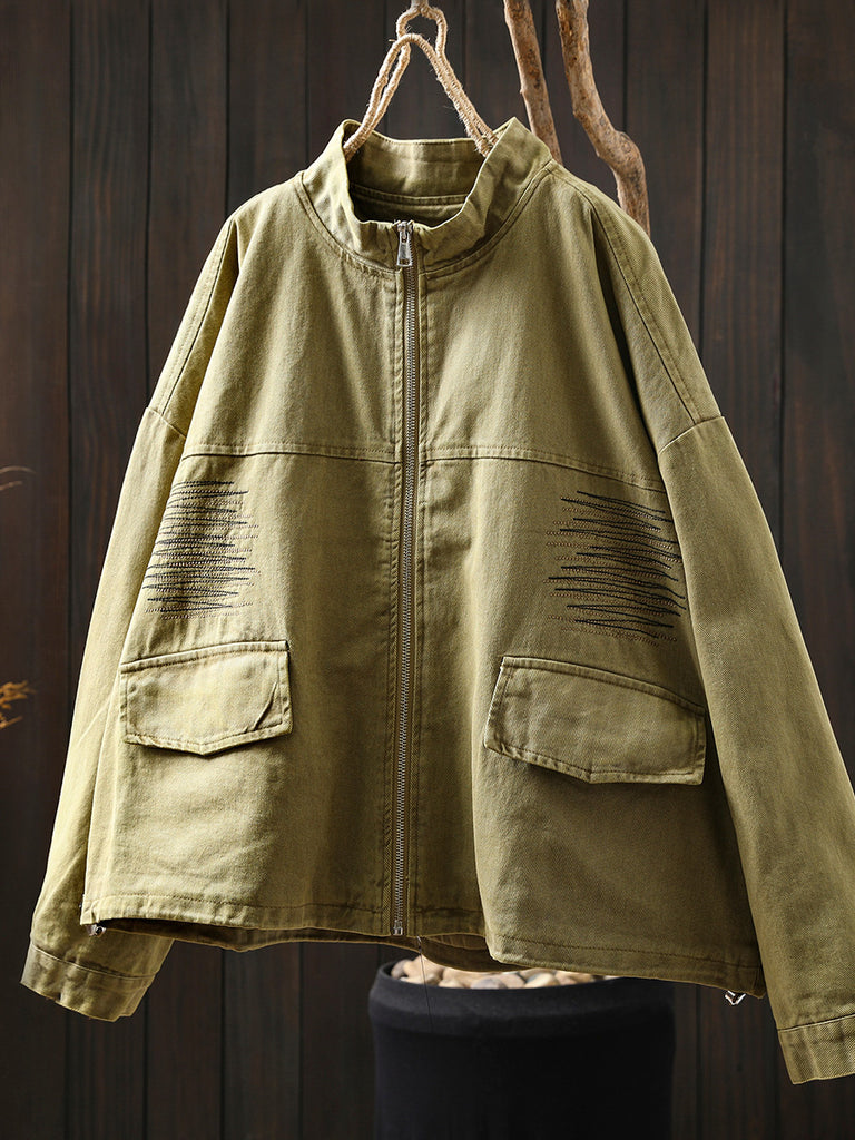 Women Casual Pure Color Stand Collar Embroidery 100%Cotton Shirt