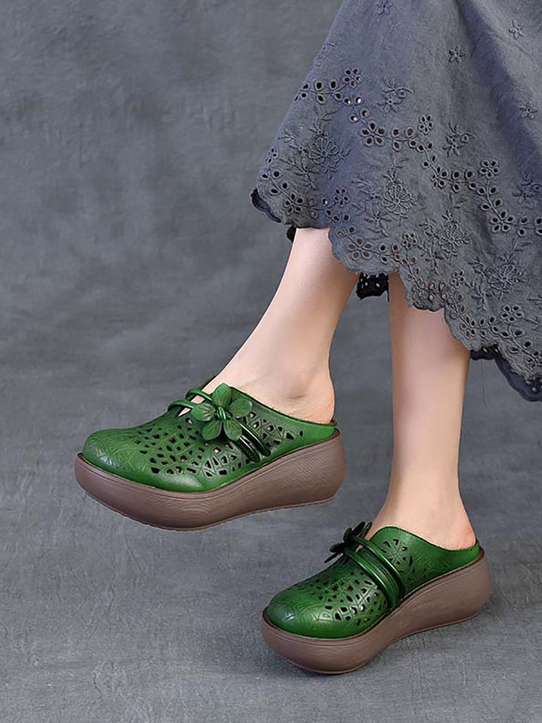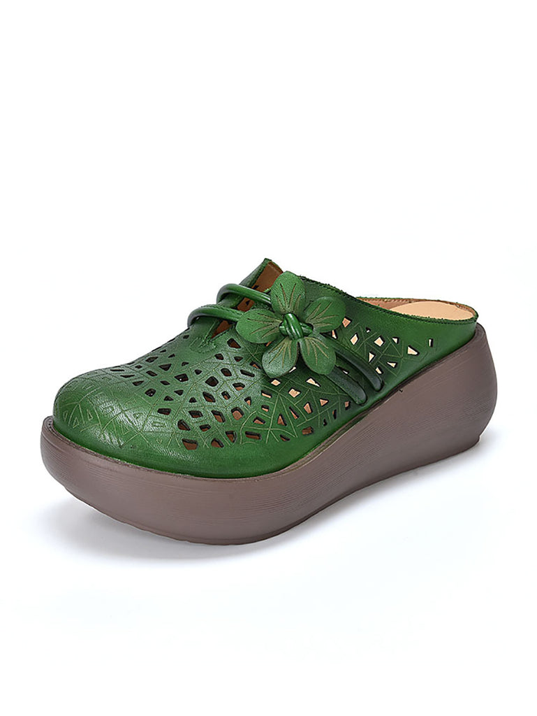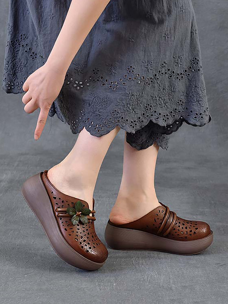 Women Ethnic Leather Flower Hollow Out Platform Slippers