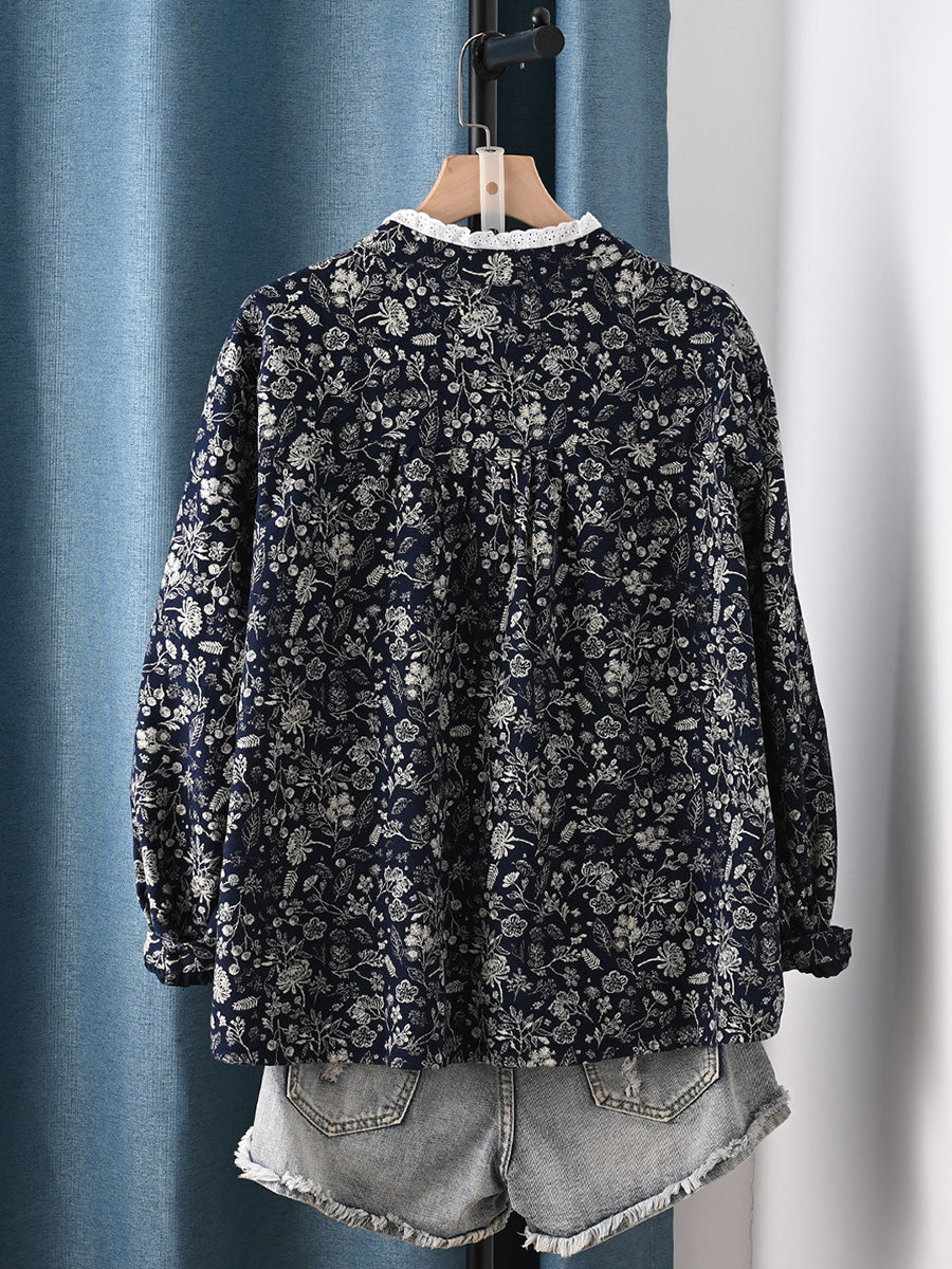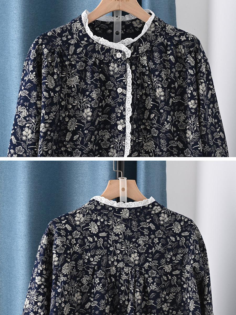 Women Spring Artsy Floral 100%Cotton Stand Collar Shirt