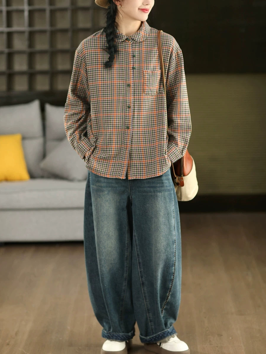 Women Spring Artsy Plaid Stand Collar 100%Cotton Shirt