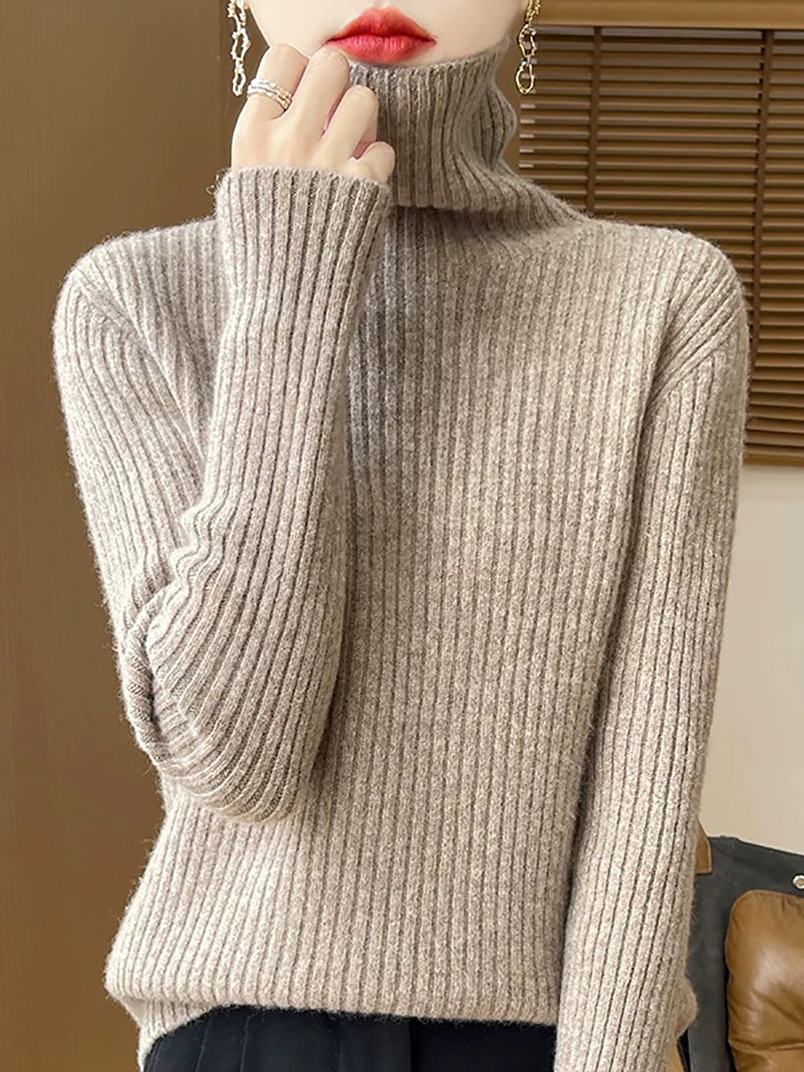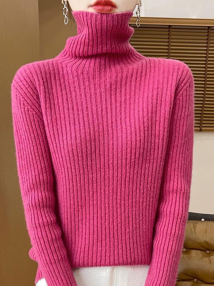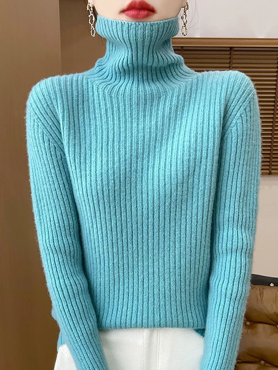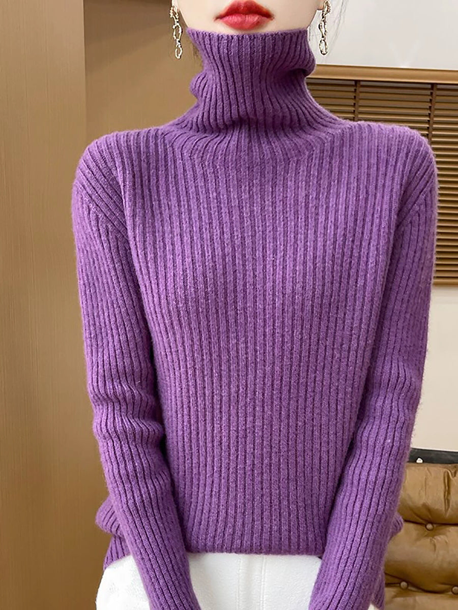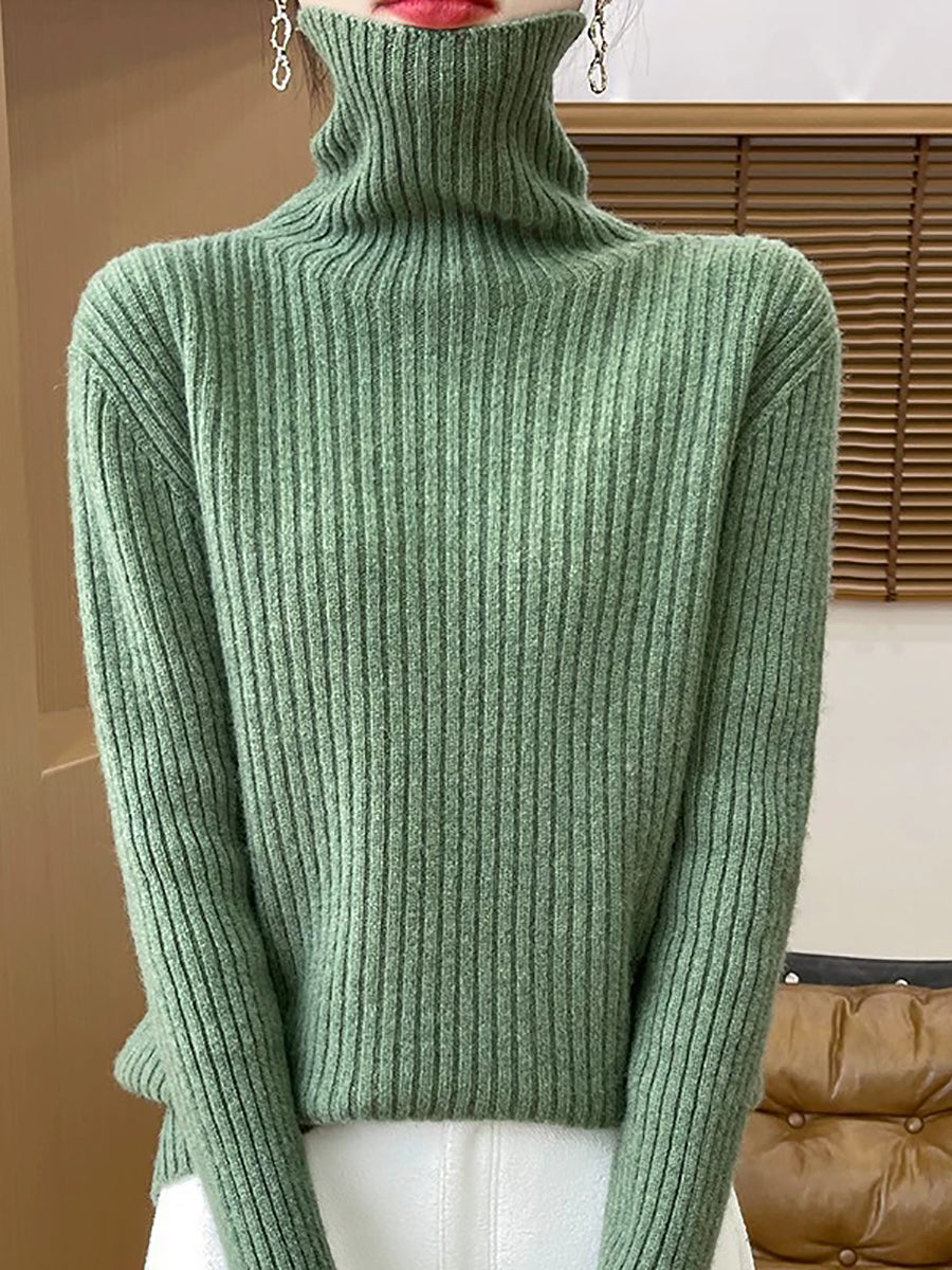Women Spring Casual Pure Color Turtleneck Wool Sweater