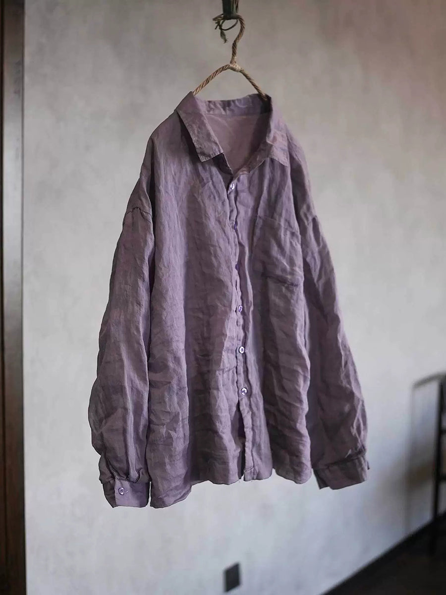 Women Spring Pure Color Turn-down Collar Ramie Shirt