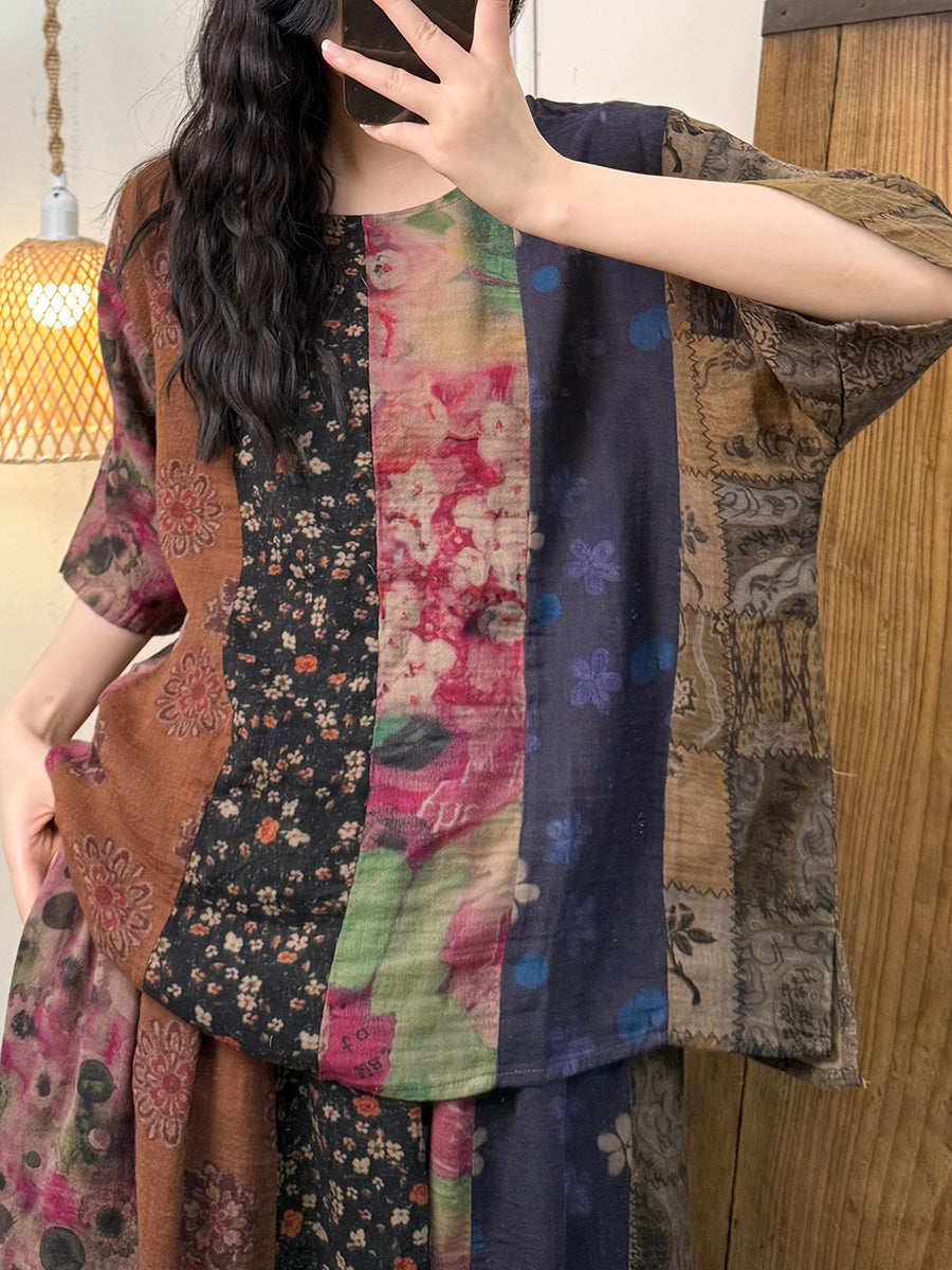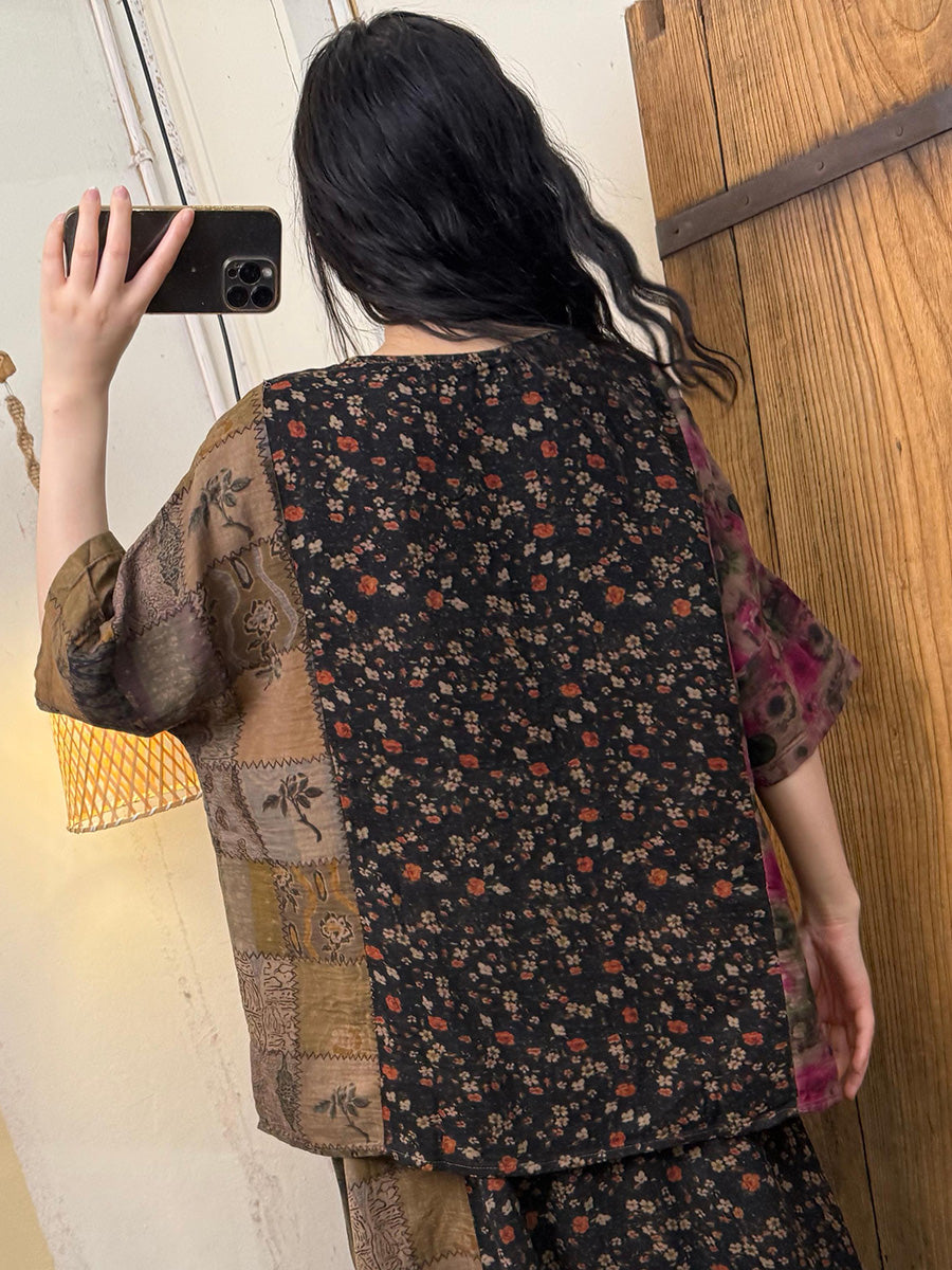 Women Summer Artsy Flower Spliced O-Neck Cotton Shirt