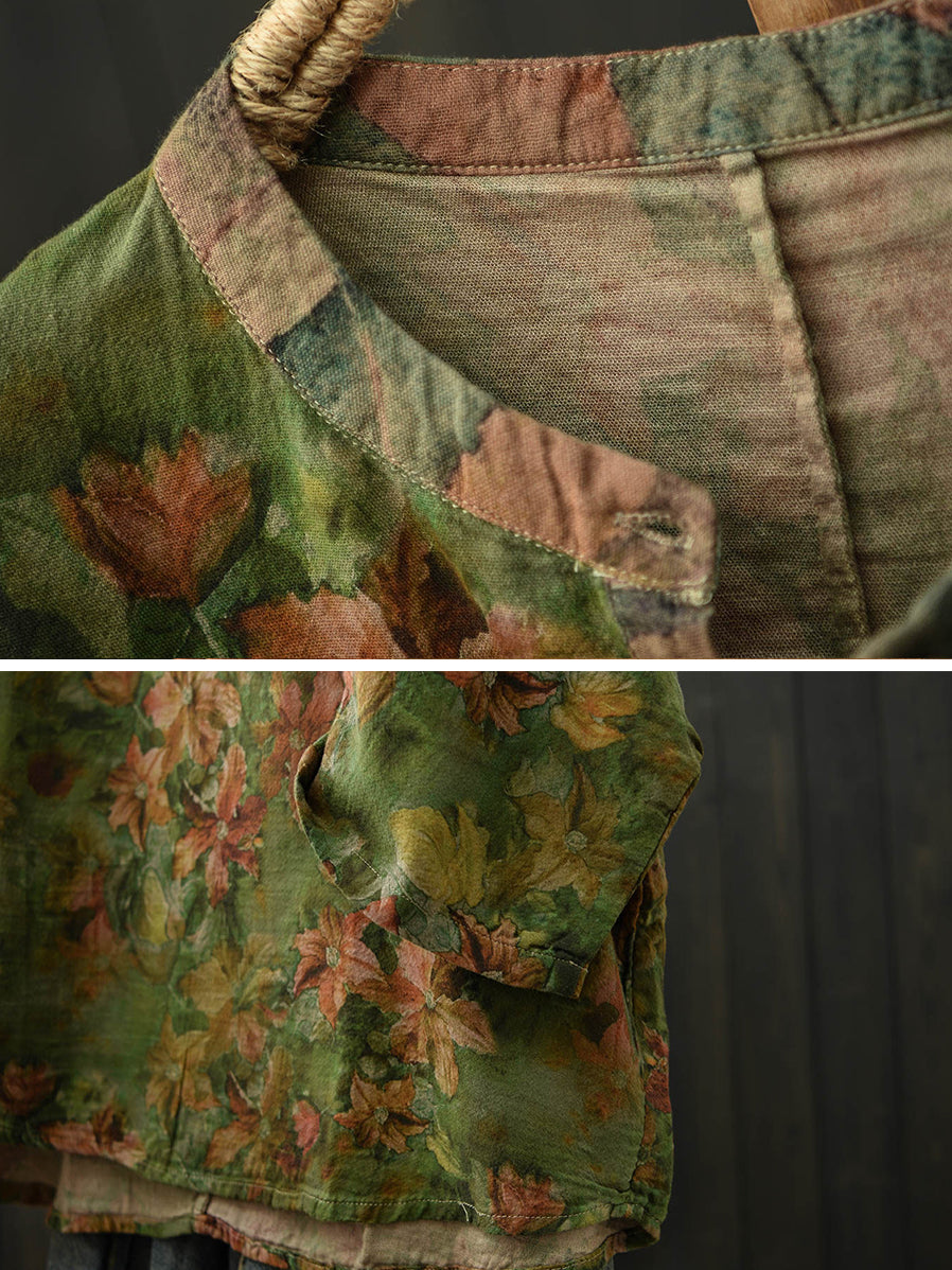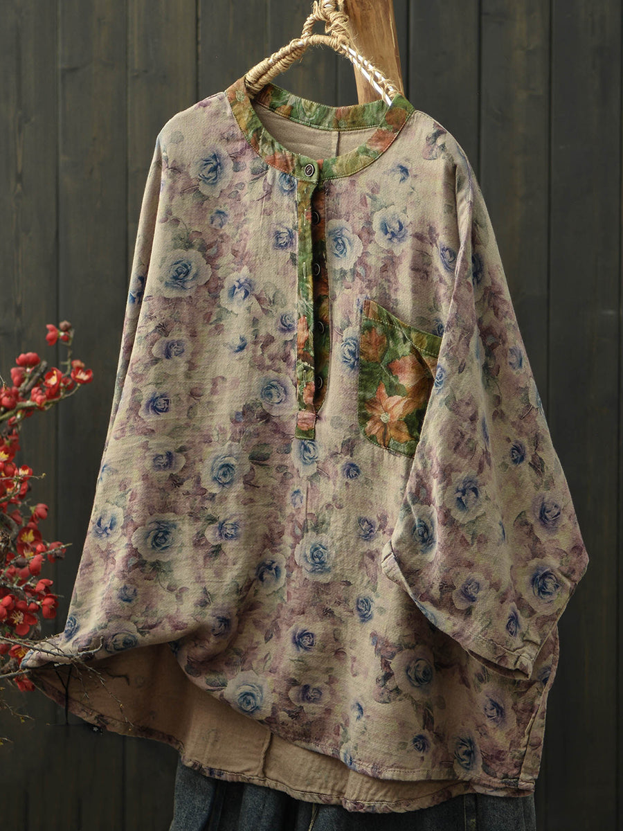 Women Summer Retro Flower Stand Collar Blouse