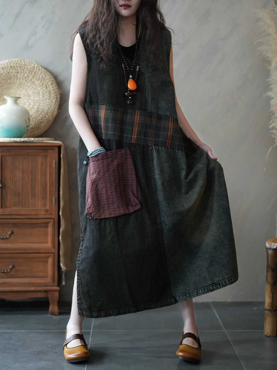 Women Summer Vintage Pathcwork Denim Vest Dress