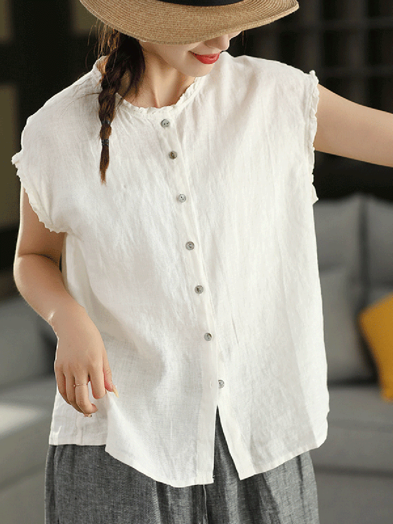 Women Summer Vintage Plaid 100%Linen O-Neck Shirt