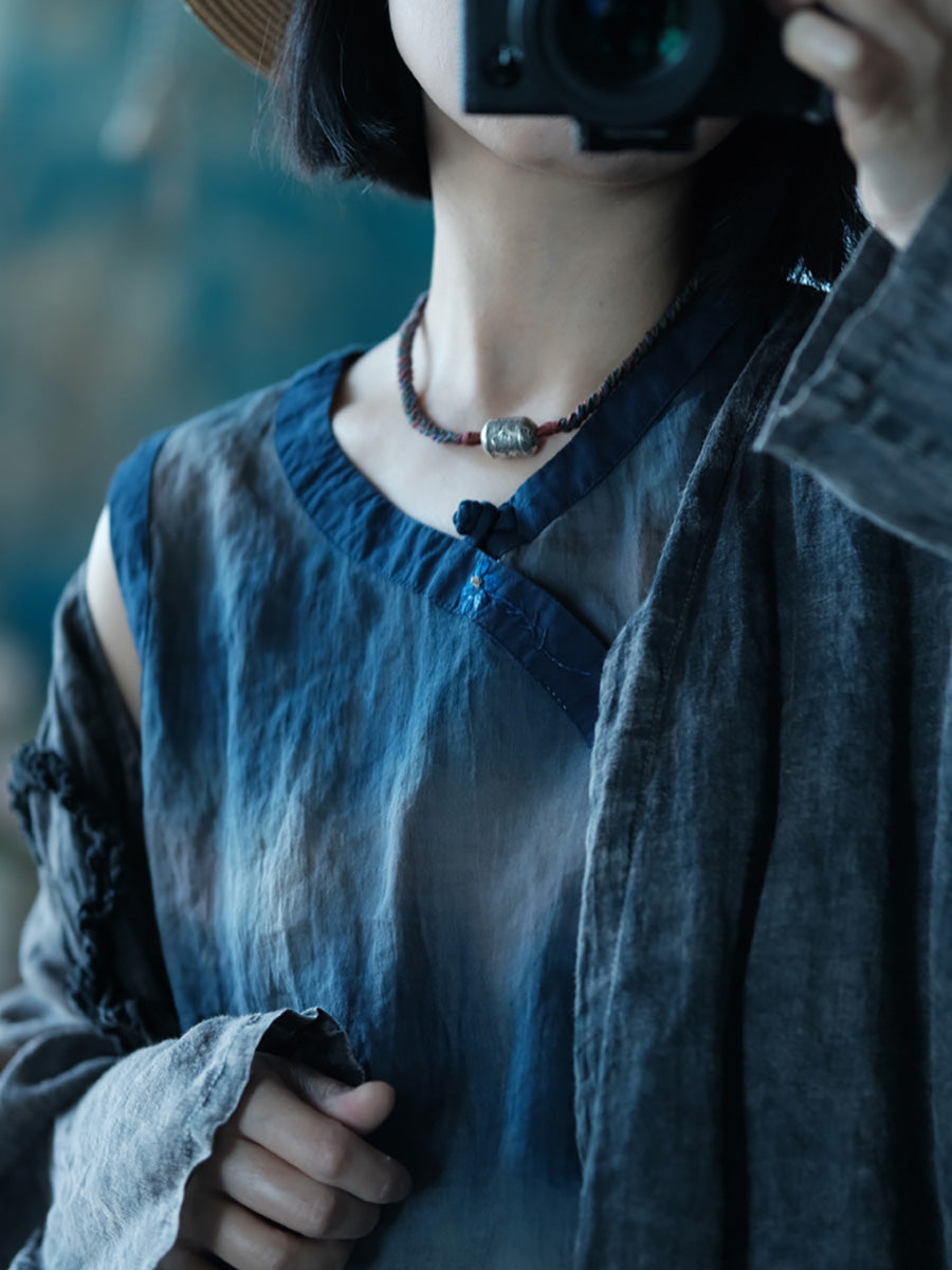 Crafted from high-quality ramie and featuring a unique tie-dye pattern, this vest boasts a stylish V-neck design that exudes an artsy vibe. Perfect for warm weather, this piece is a must-have for any fashion-forward woman's spring and summer wardrobe.