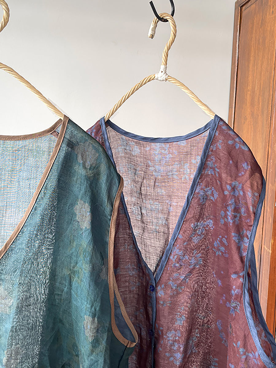 Women Vintage Floral Print Ramie Vest