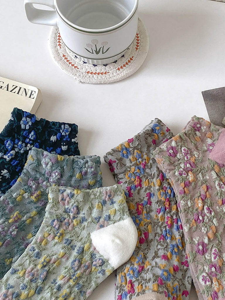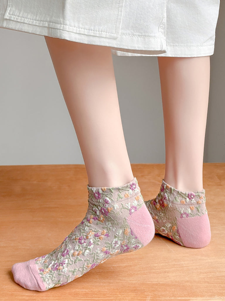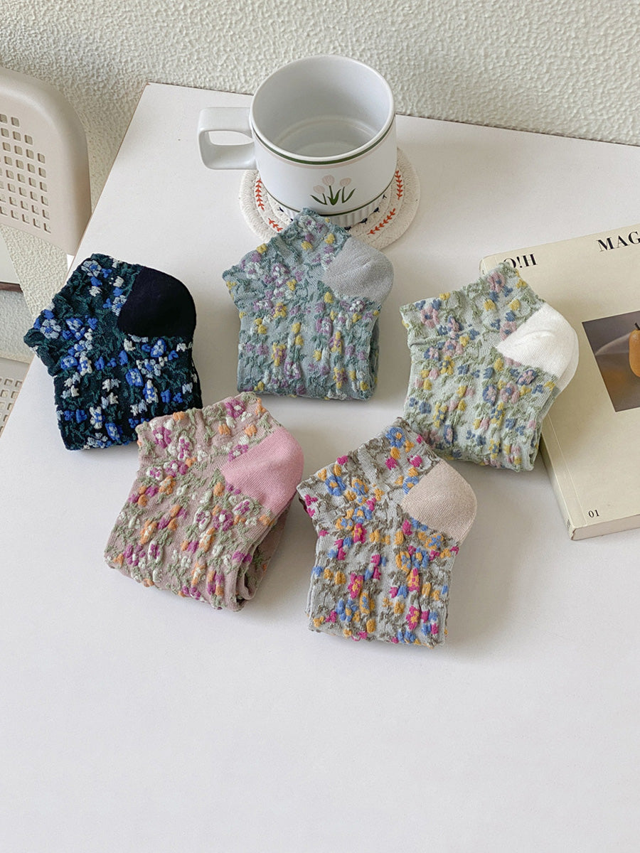 5 paia di calzini corti da donna con motivo floreale jacquard colorblock