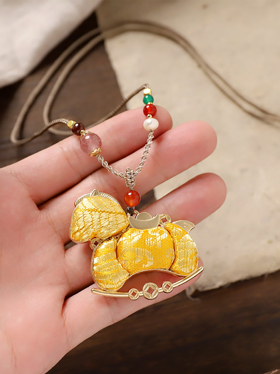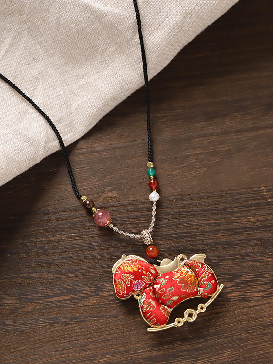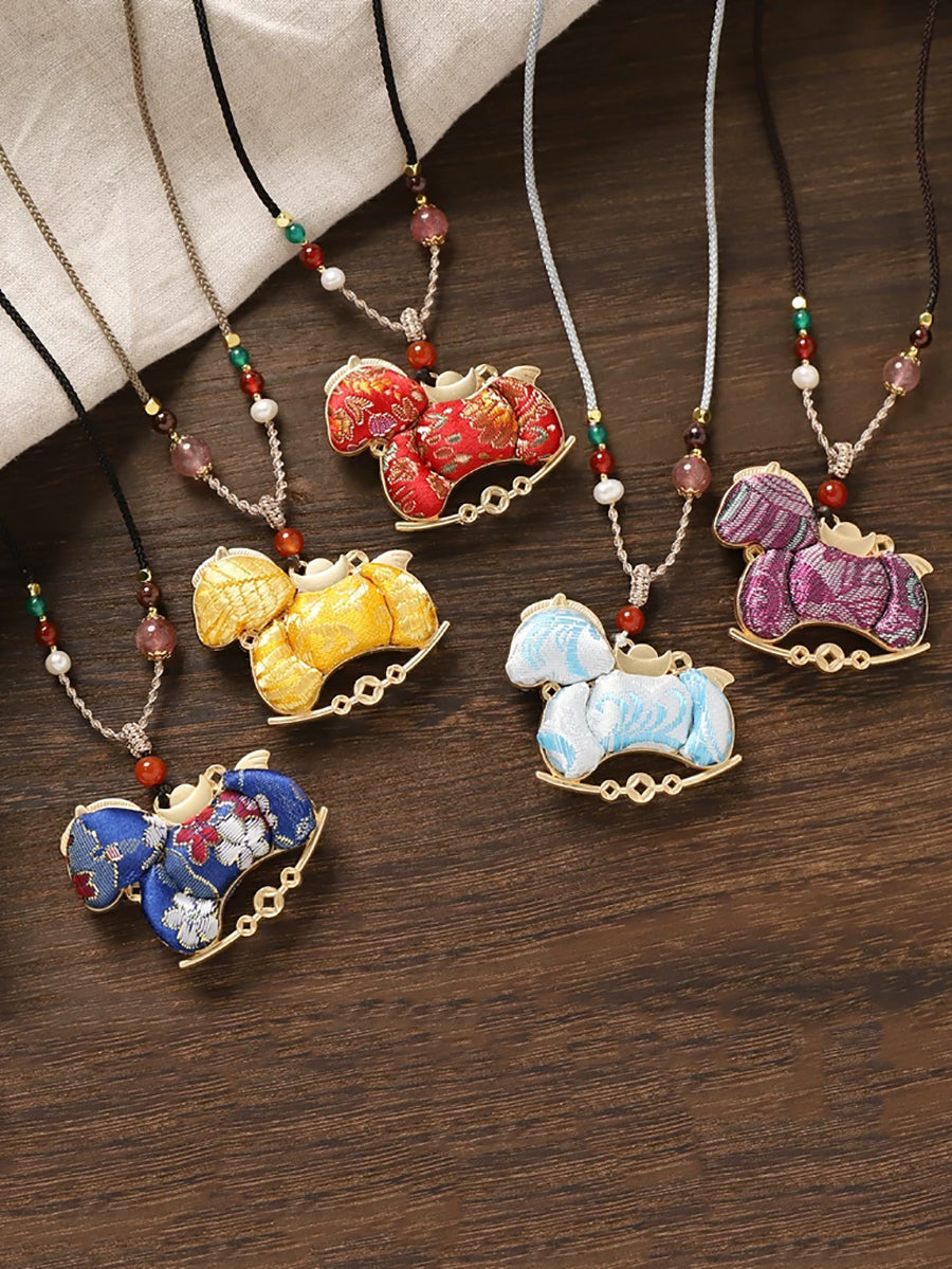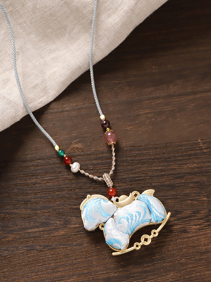 Collana lunga con pendente etnico a forma di cavallo in broccato bifacciale