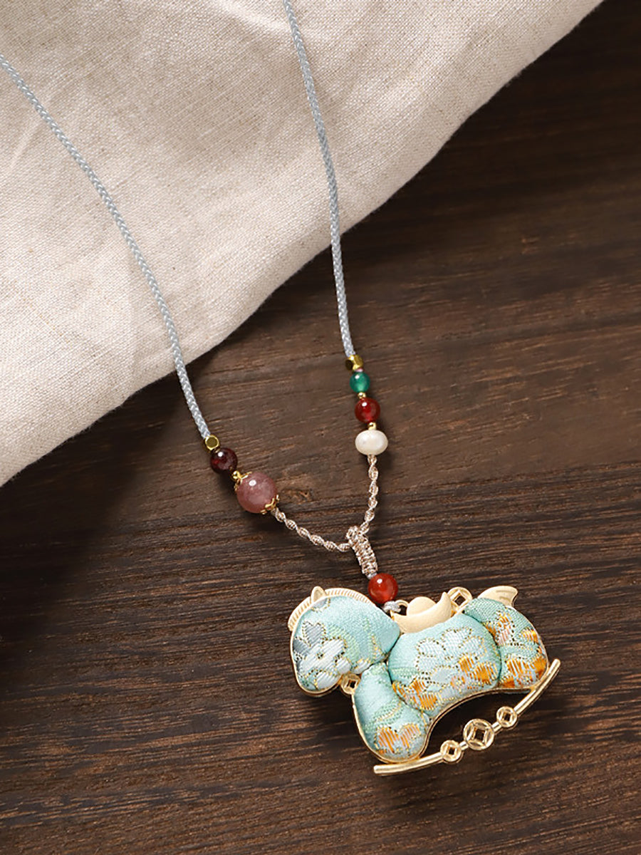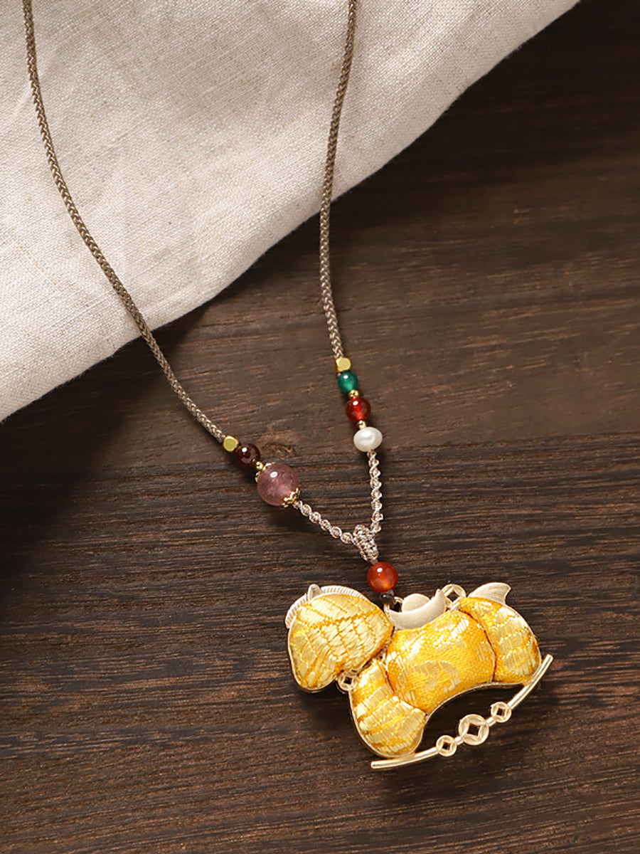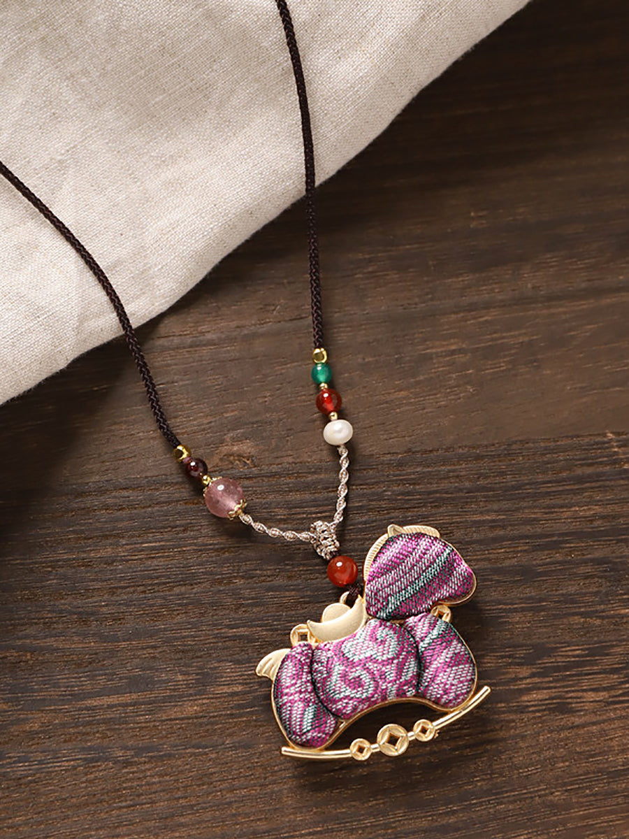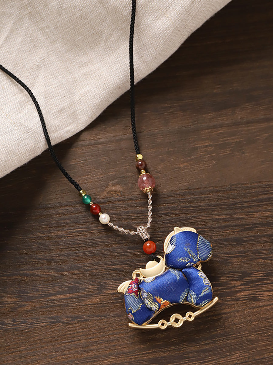Collana lunga con pendente etnico a forma di cavallo in broccato bifacciale