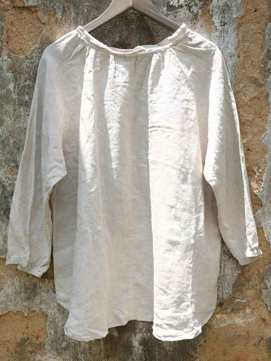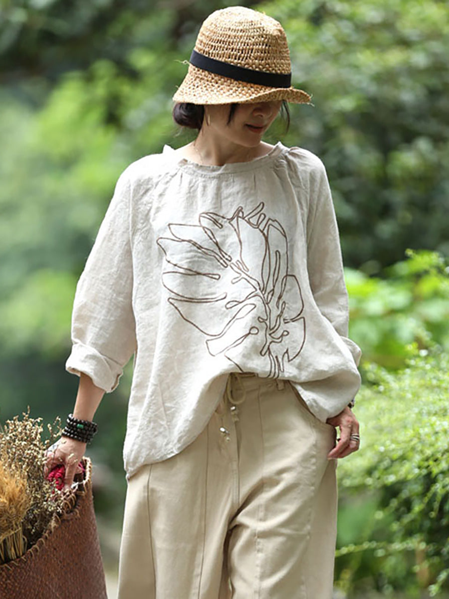 Taglie forti - T-shirt in lino sciolto autunnale a maniche lunghe con ricamo