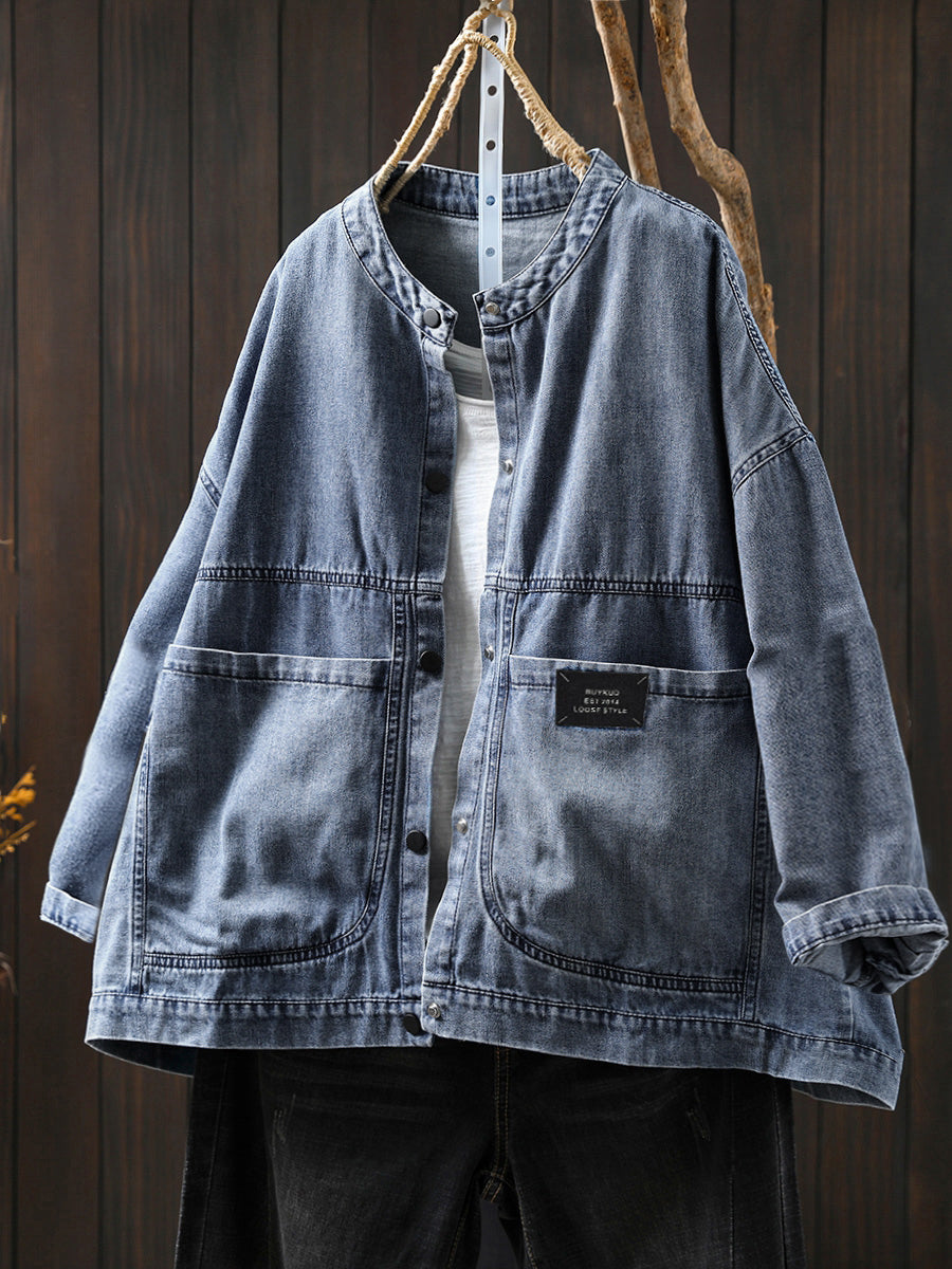 Cappotto in denim con collo alto, estivo, retrò, colore puro, taglie forti, da donna