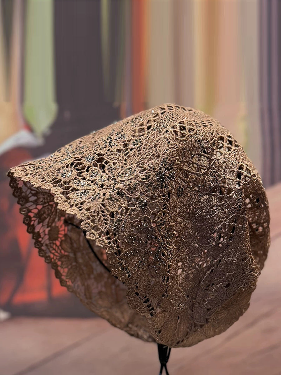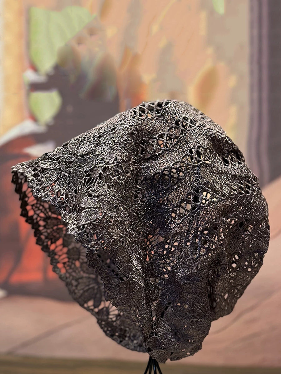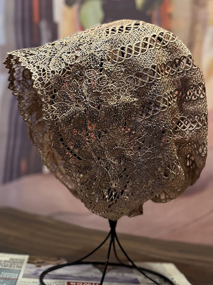 Cappello estivo lavorato a maglia con motivo floreale traforato e lavorazione a pizzo.