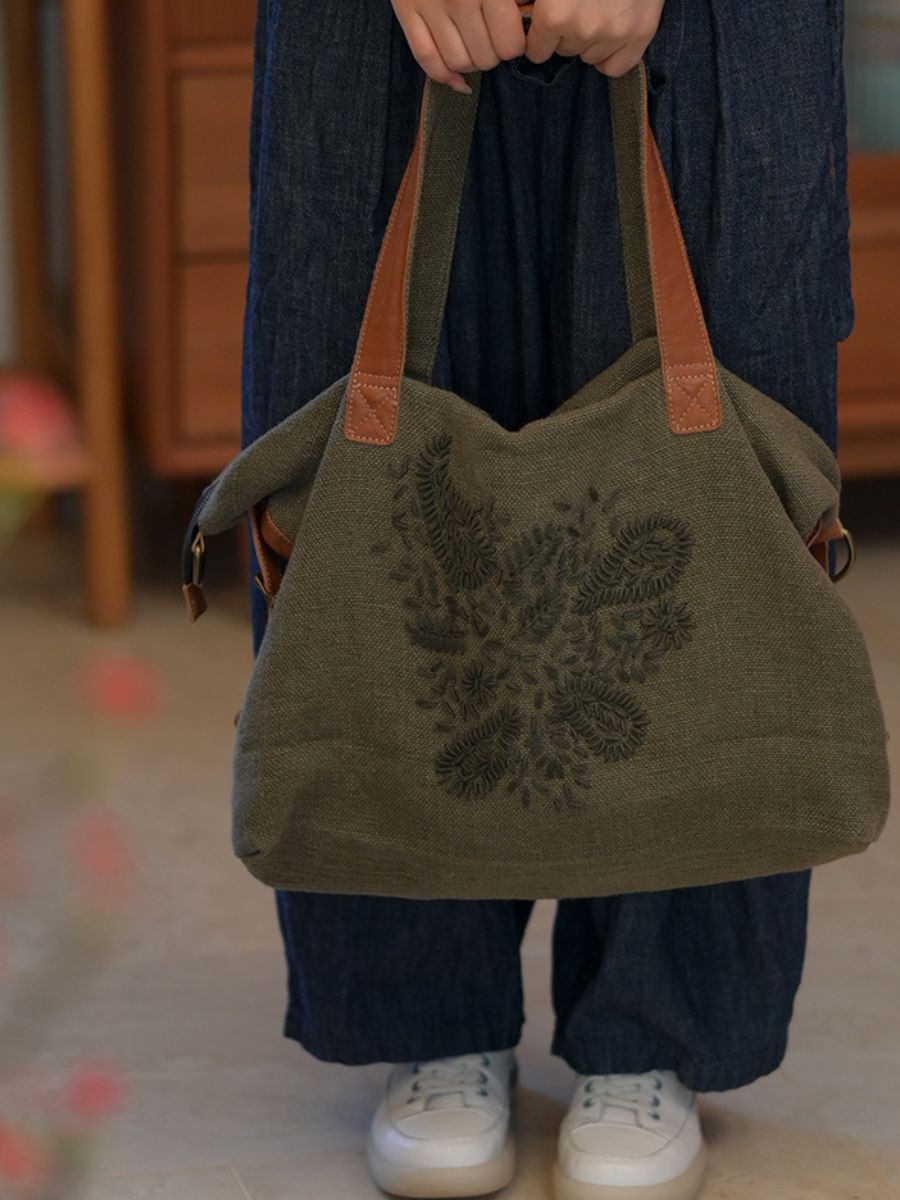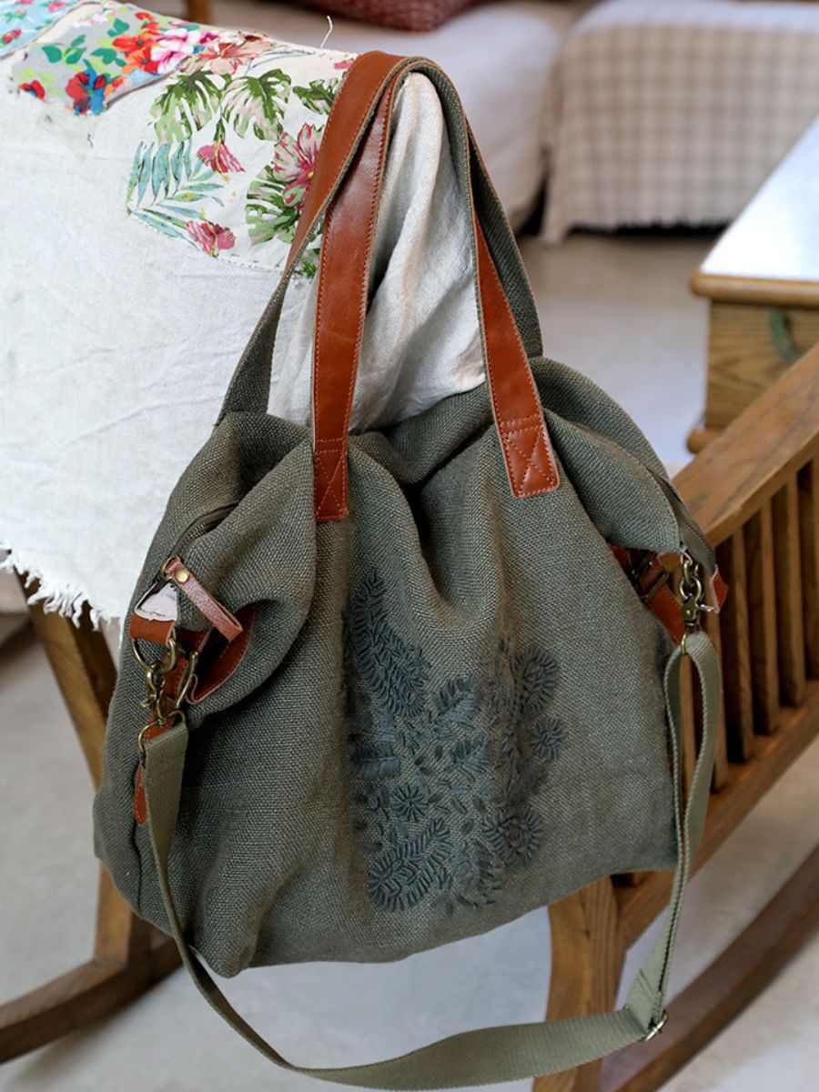 03022 Borsa a tracolla vintage ricamata in cotone e lino