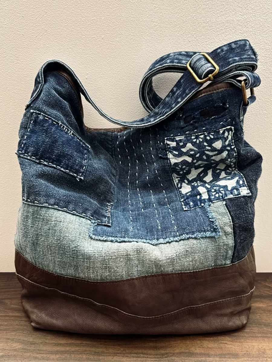 Borsa vintage in denim con patchwork floreale e inserti in pelle
