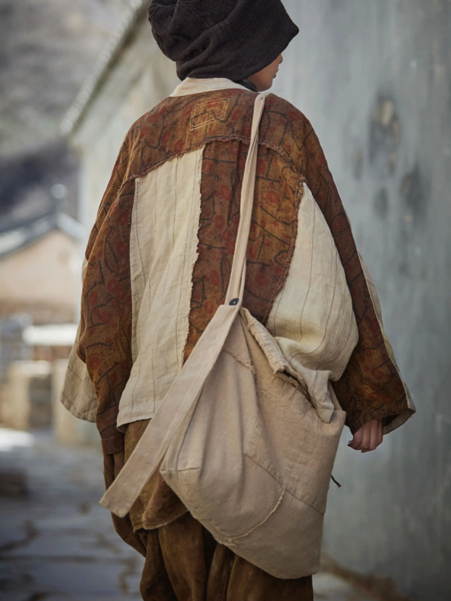 041202 Borsa a tracolla vintage beige in lino con inserti