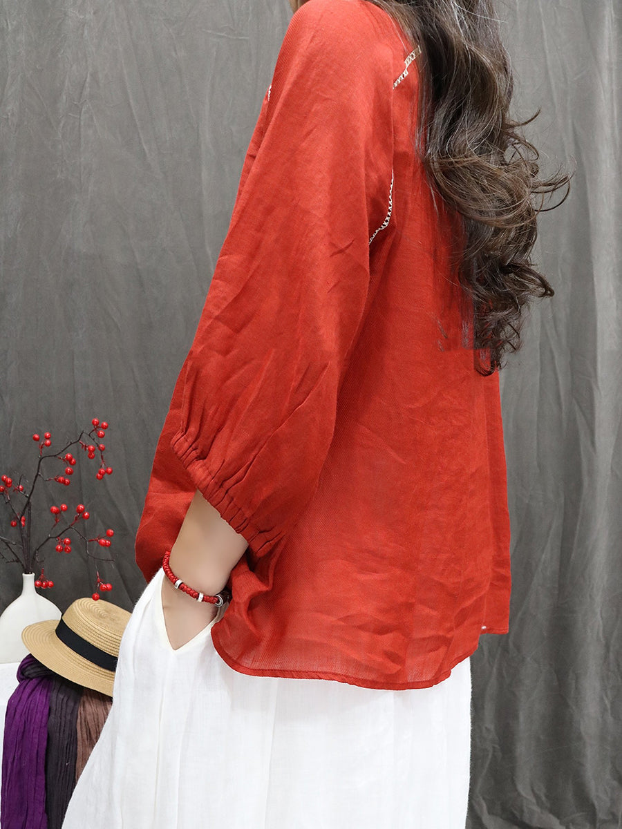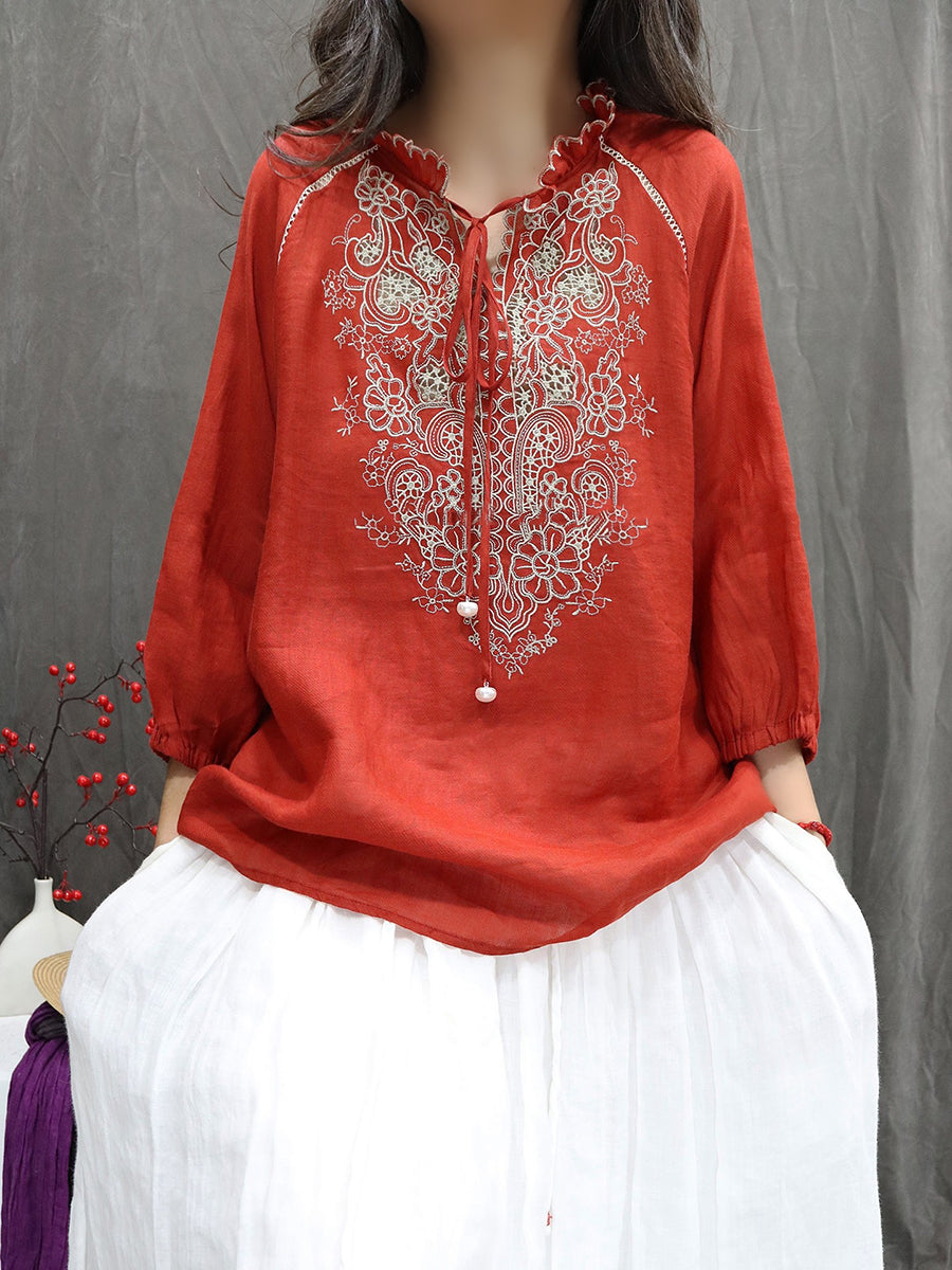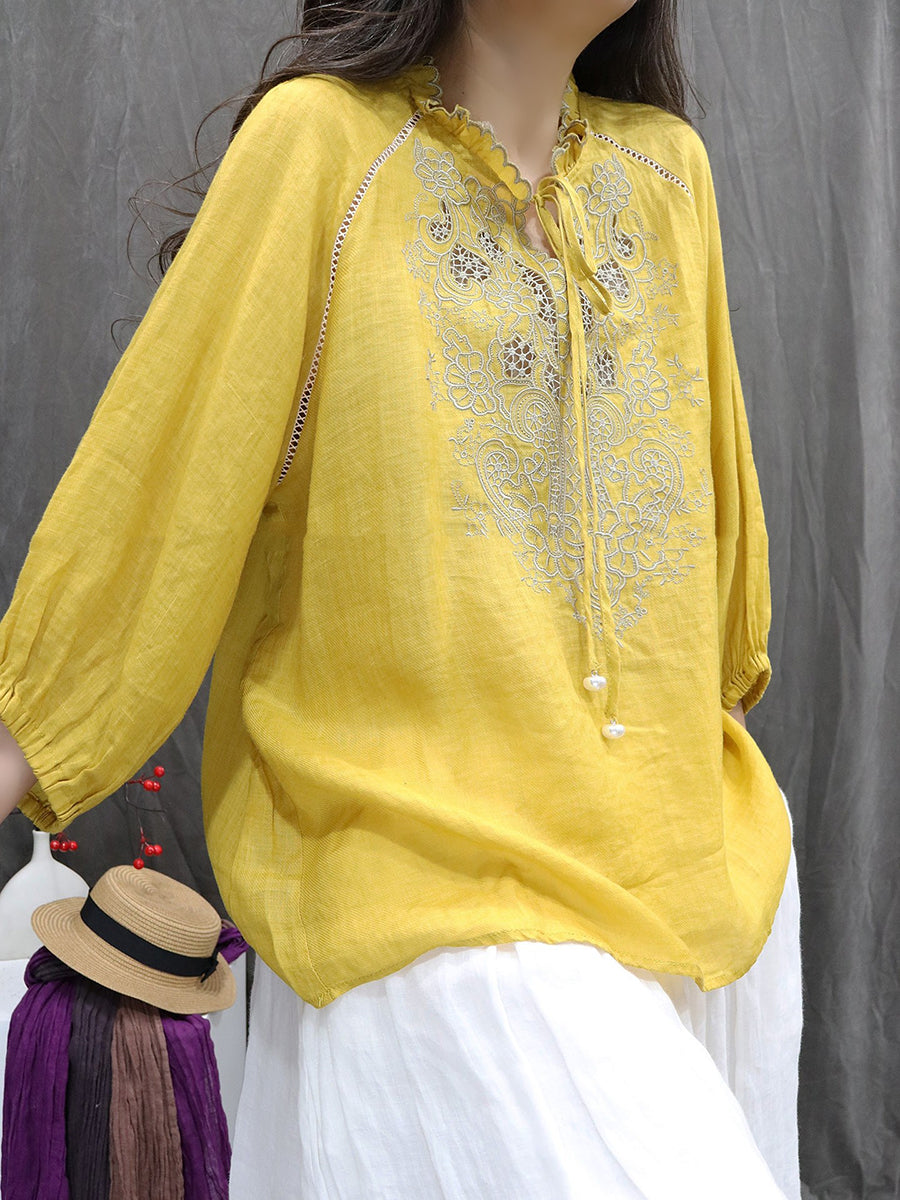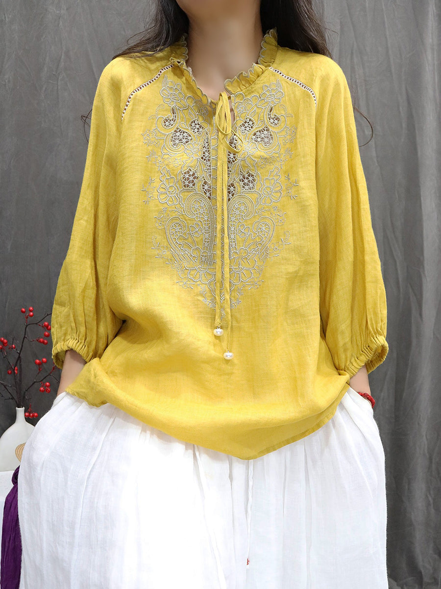 Camicetta da donna con colletto alto e ricamo primaverile in 100% ramiè