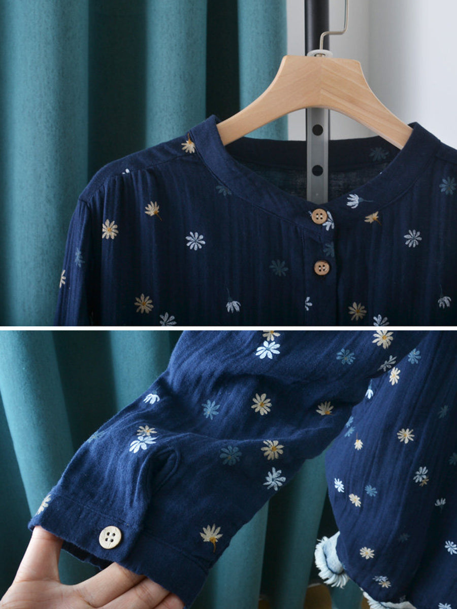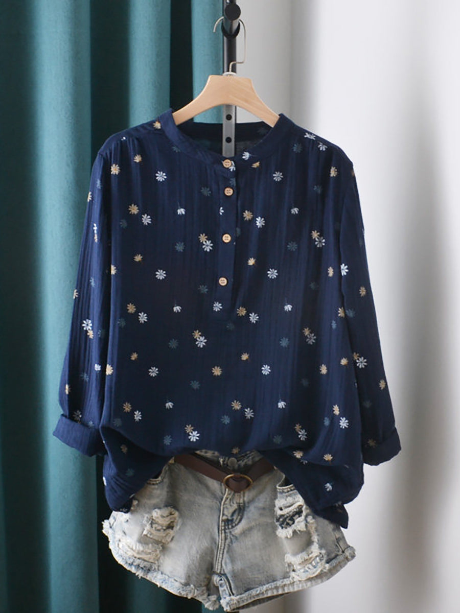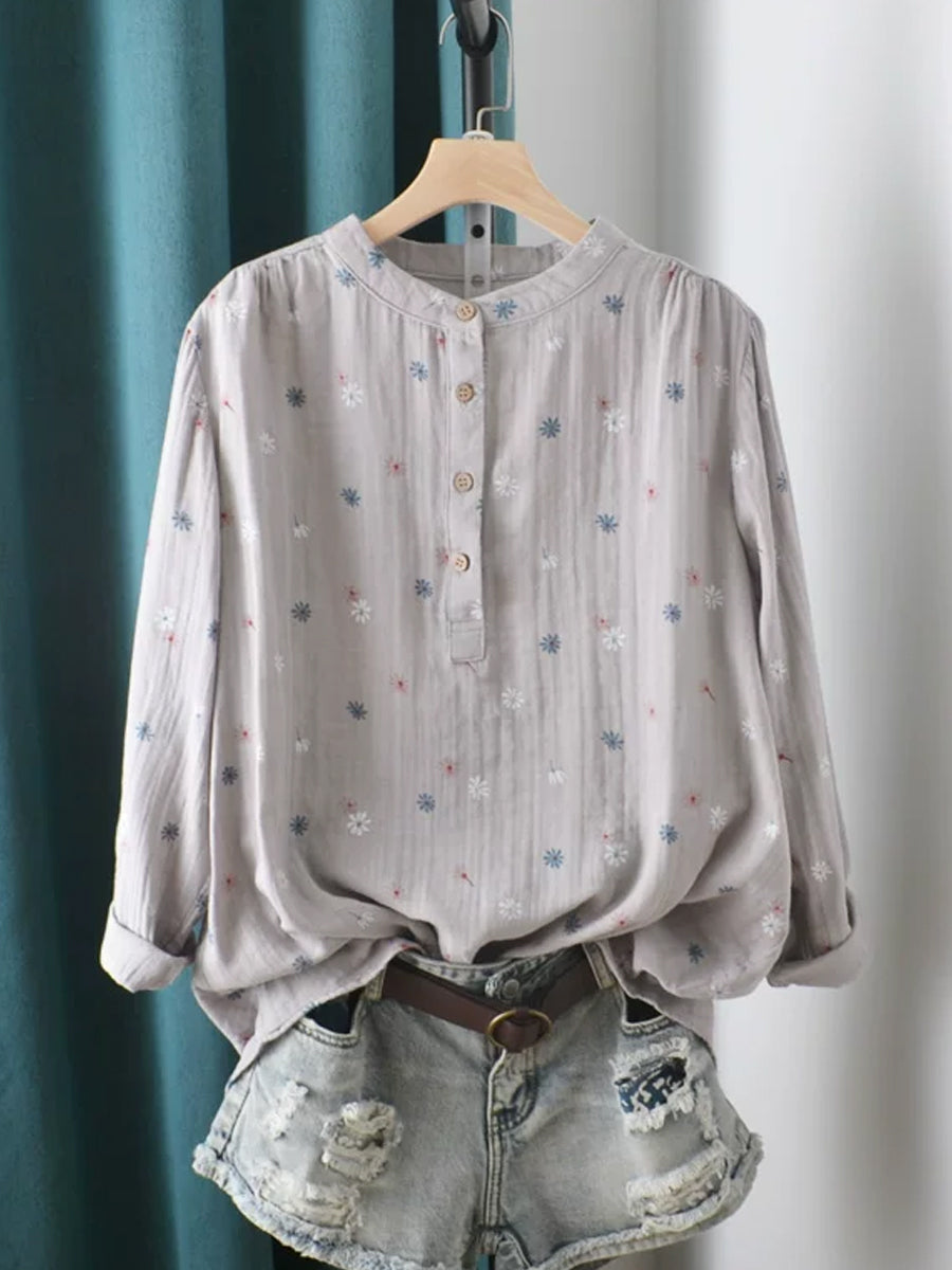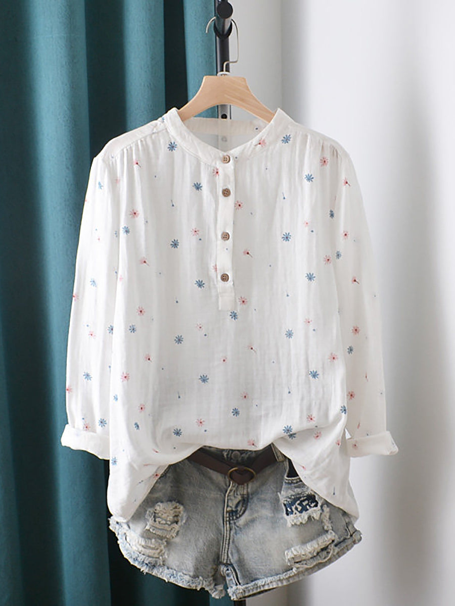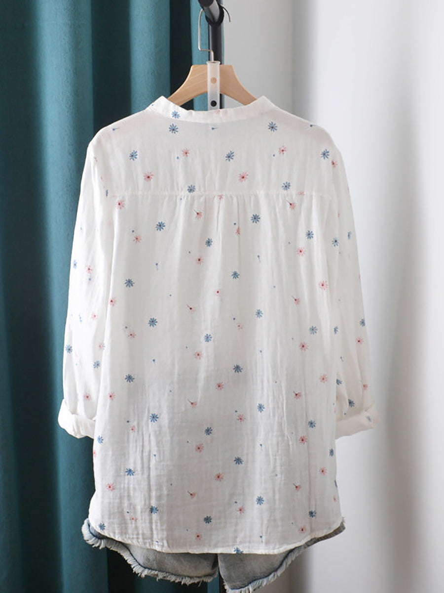 Camicetta da donna con colletto rialzato e motivo floreale primaverile artistico