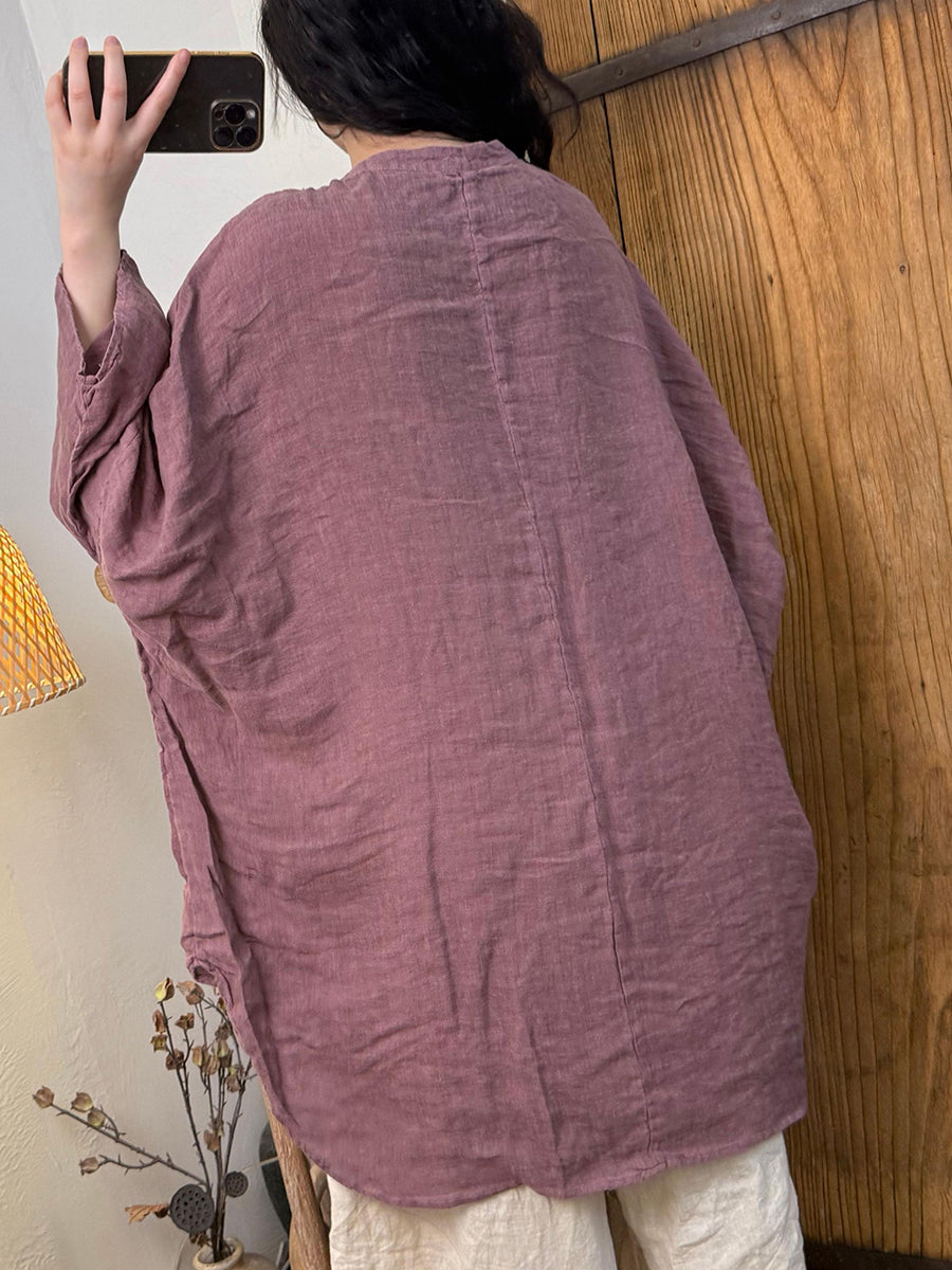 Camicia da donna in lino con colletto rialzato, stile retrò autunnale, colore puro