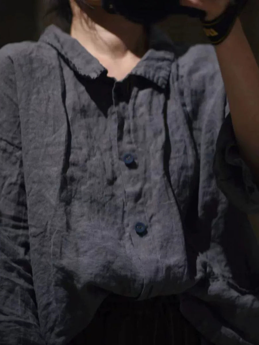 Camicia da donna in lino con colletto rovesciato, stile retrò autunnale, di colore puro