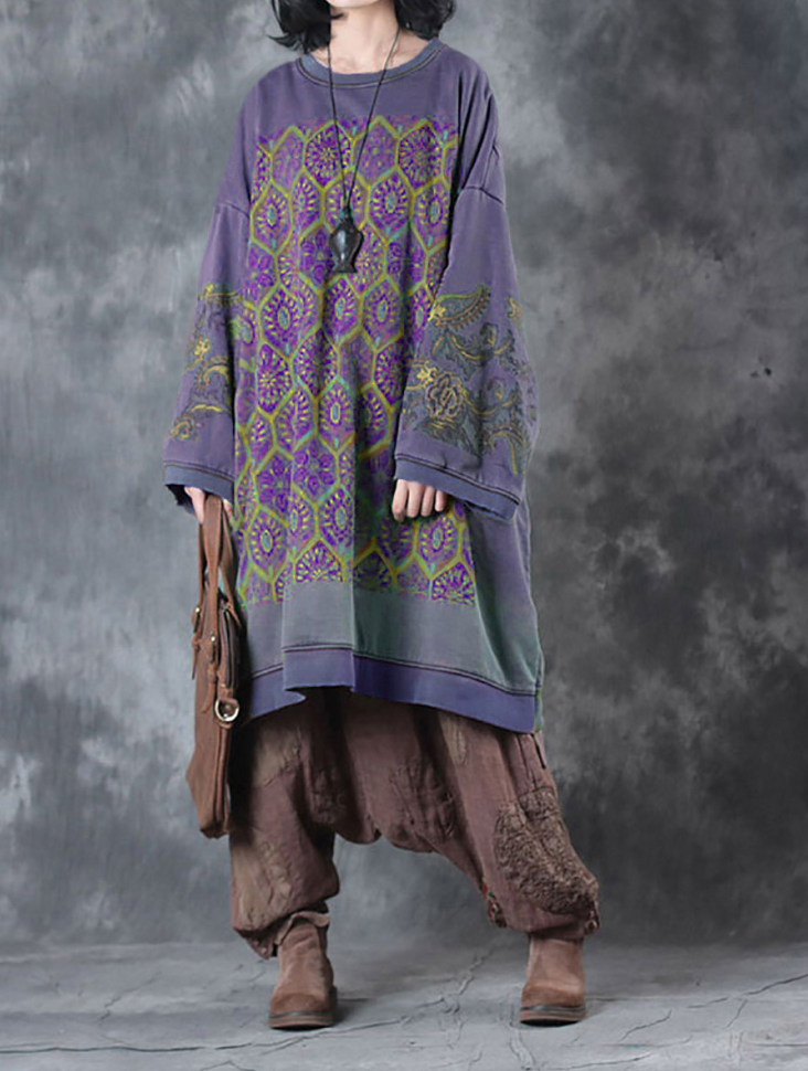 Questo vestito è fatto di cotone e presenta un motivo floreale. Ha un colletto a O, maniche raglan lunghe e uno stile vintage perfetto sia per l'autunno che per la primavera.