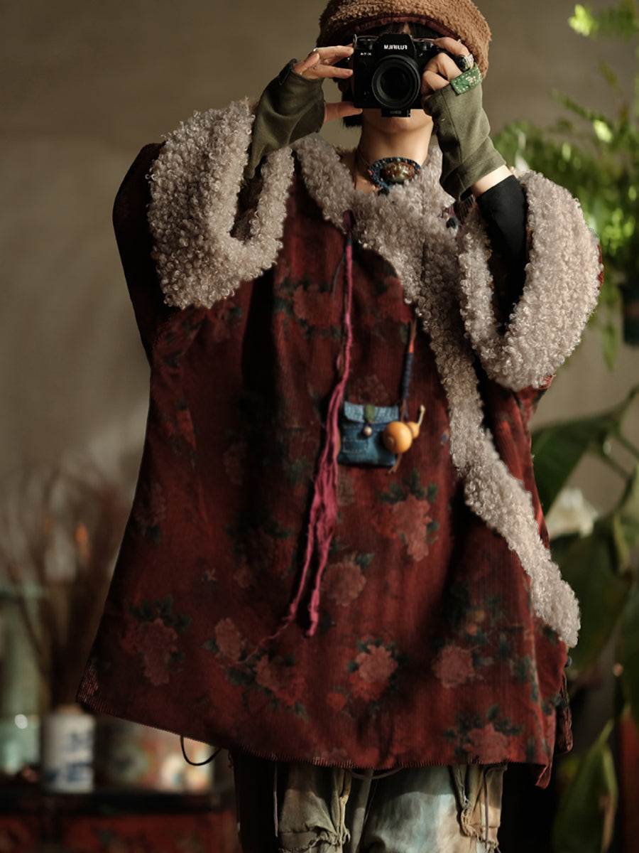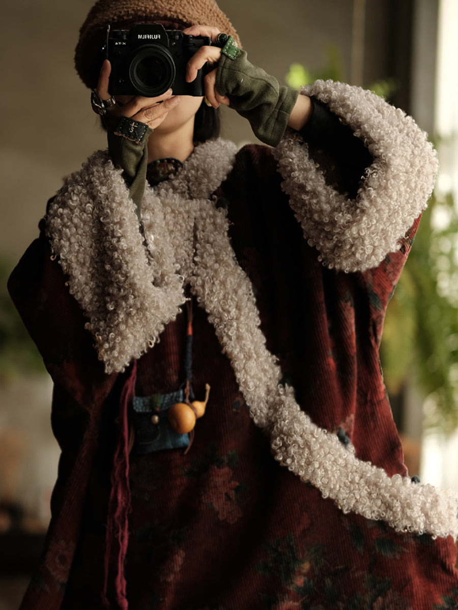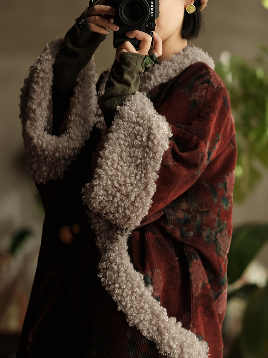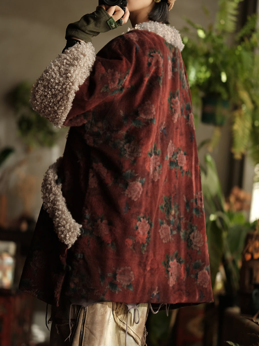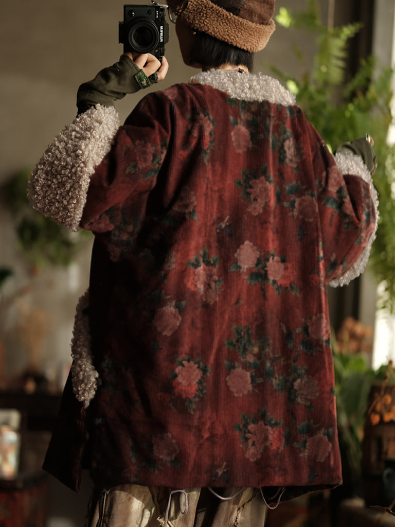Cappotto imbottito in velluto a coste con fiori etnici da donna