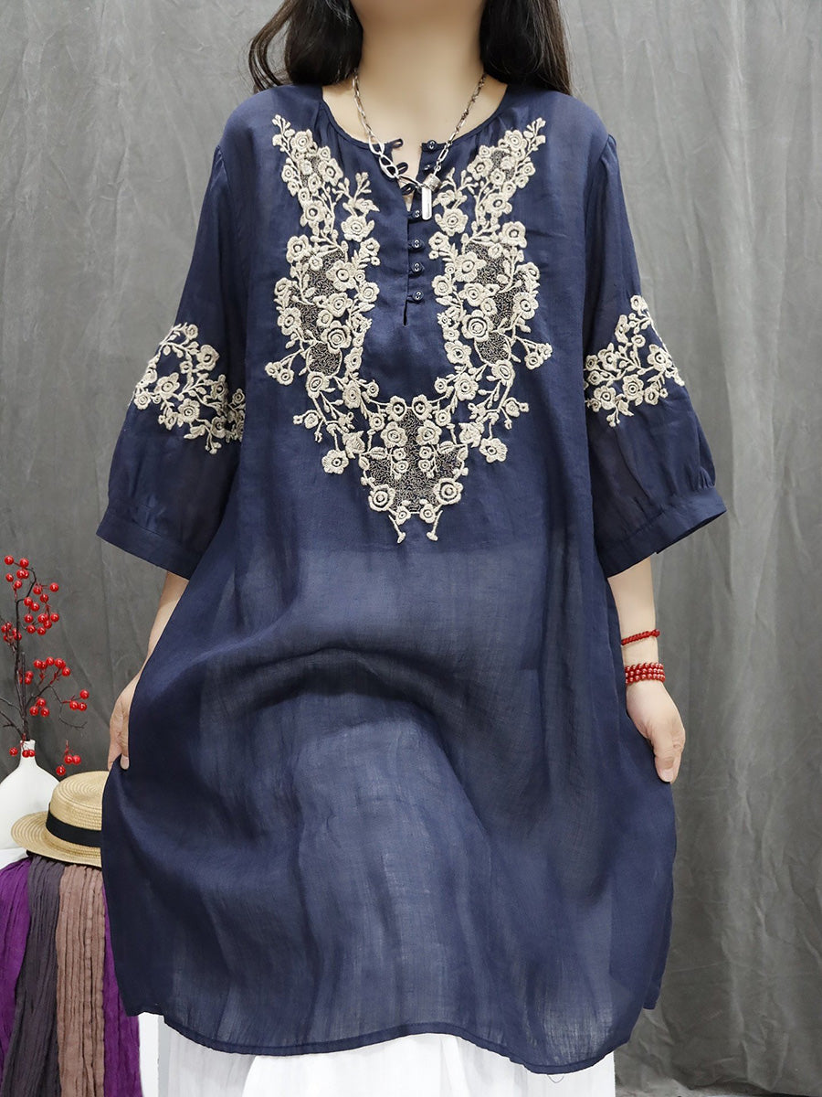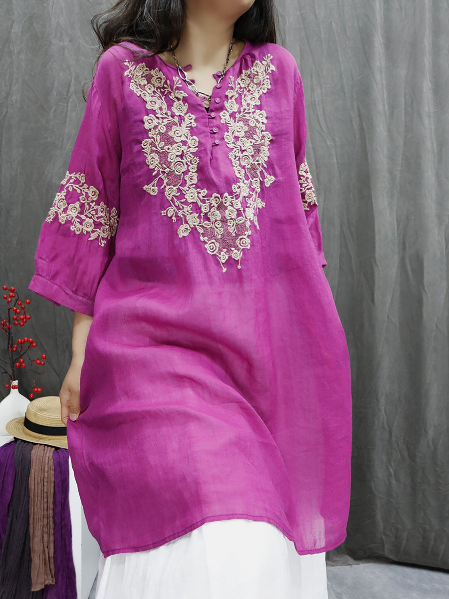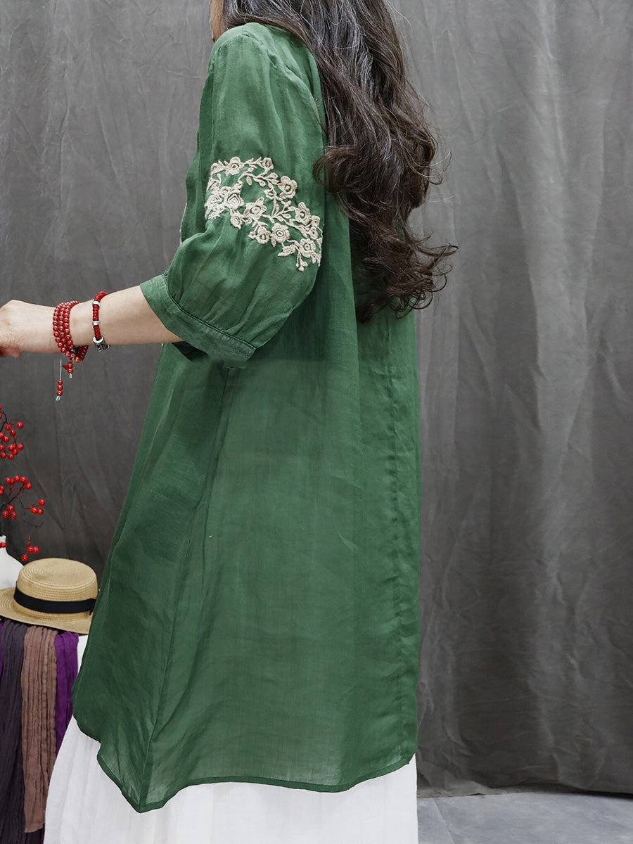 Camicia da donna con scollo a V, 100% ramia, con ricamo floreale artistico primaverile