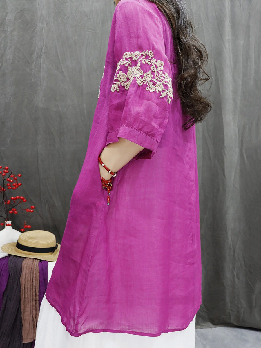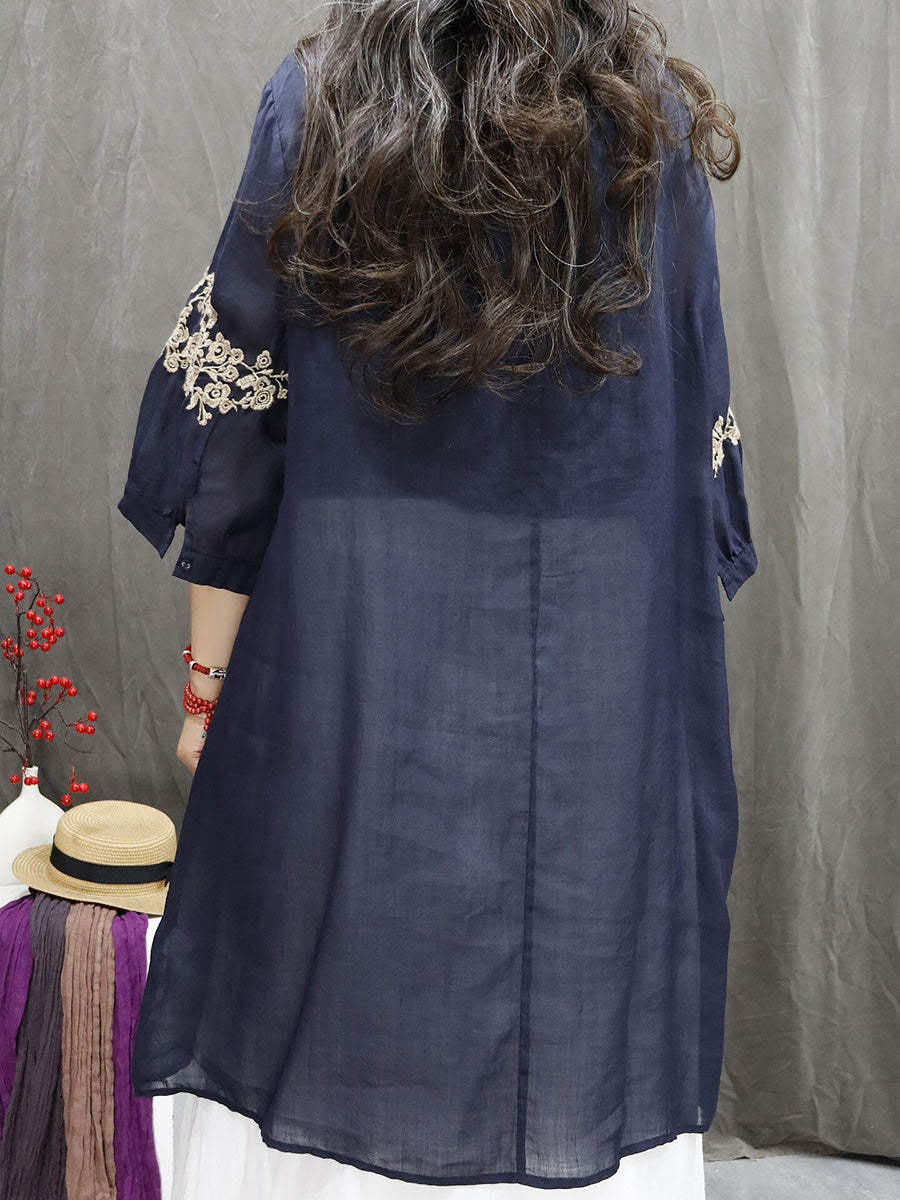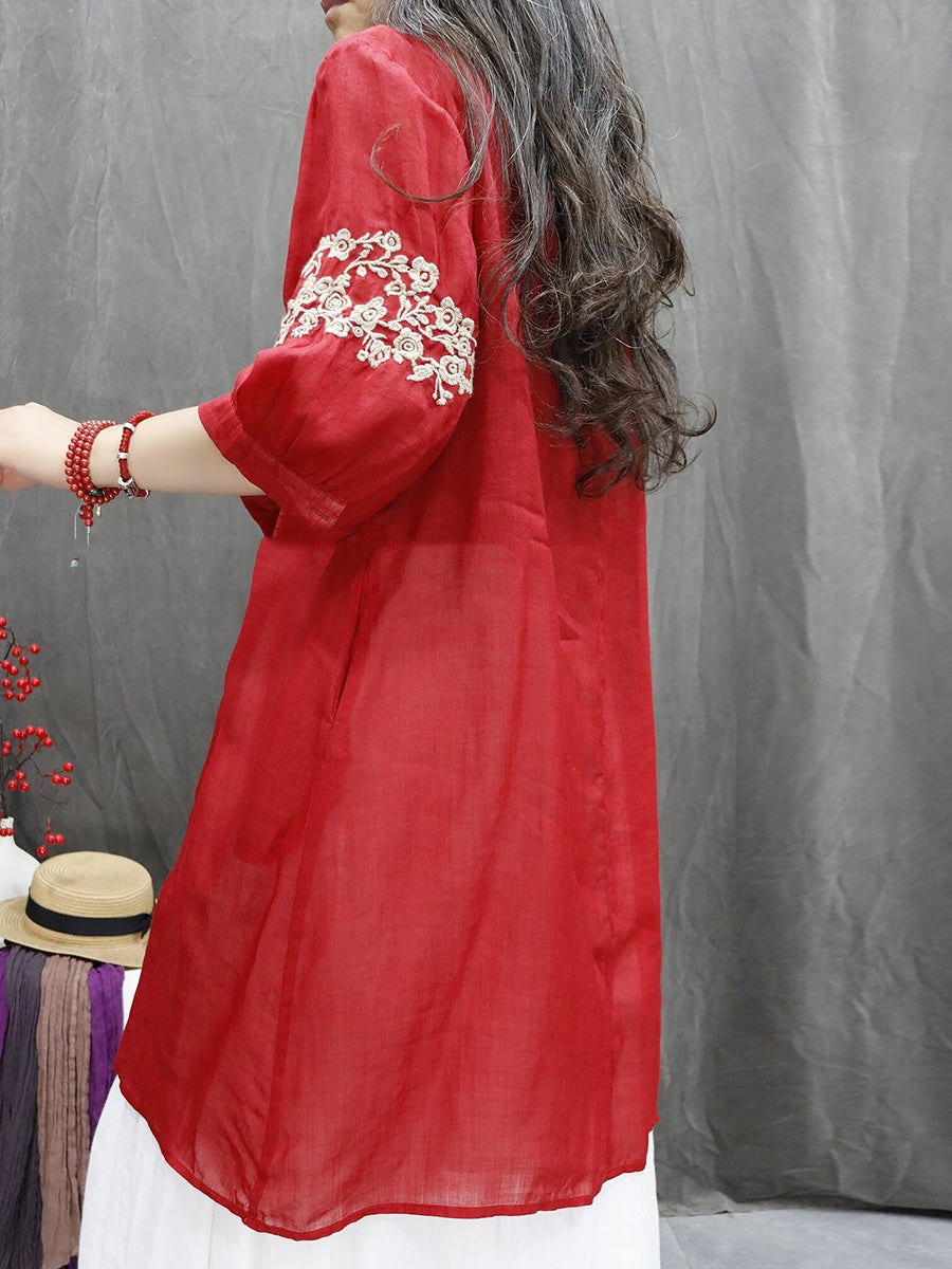 Camicia da donna con scollo a V, 100% ramia, con ricamo floreale artistico primaverile